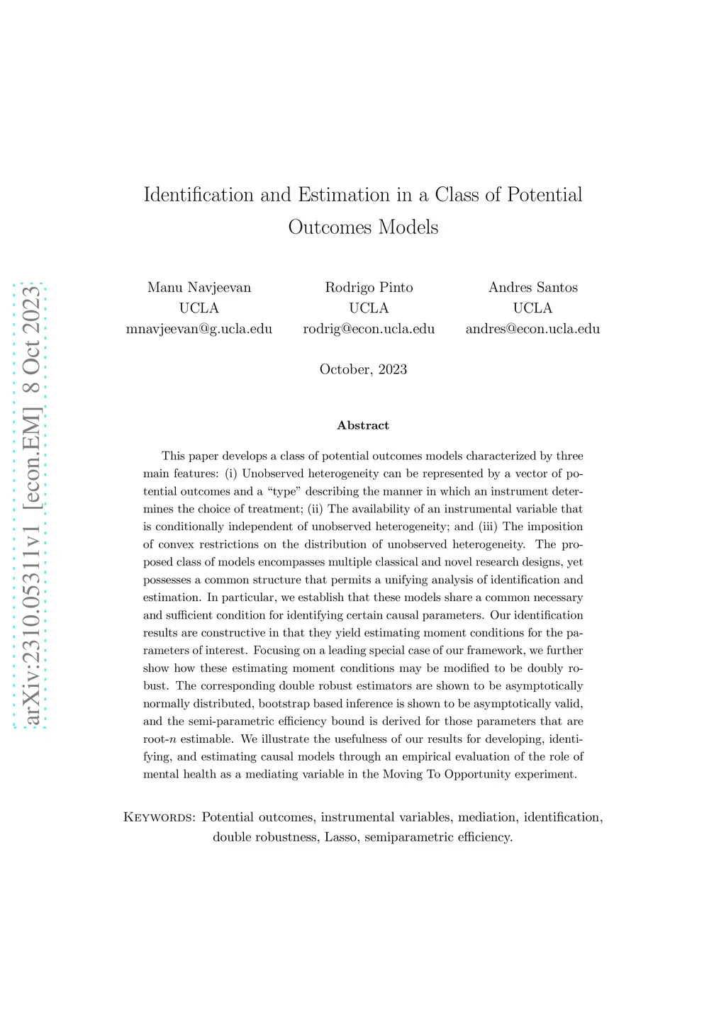 This paper develops a class of potential outcomes models characterized by three main features: (i) Unobserved heterogeneity can be represented by a vector of potential outcomes and a type describing the manner in which an instrument determines the choice of treatment; (ii) The availability of an instrumental variable that is conditionally independent of unobserved heterogeneity; and (iii) The imposition of convex restrictions on the distribution of unobserved heterogeneity. The proposed class of models encompasses multiple classical and novel research designs, yet possesses a common structure that permits a unifying analysis of identification and estimation. In particular, we establish that these models share a common necessary and sufficient condition for identifying certain causal parameters. Our identification results are constructive in that they yield estimating moment conditions for the parameters of interest. Focusing on a leading special case of our framework, we further show how these estimating moment conditions may be modified to be doubly robust. The corresponding double robust estimators are shown to be asymptotically normally distributed, bootstrap based inference is shown to be asymptotically valid, and the semi-parametric efficiency bound is derived for those parameters that are root-n estimable. We illustrate the usefulness of our results for developing, identifying, and estimating causal models through an empirical evaluation of the role of mental health as a mediating variable in the Moving To Opportunity experiment.