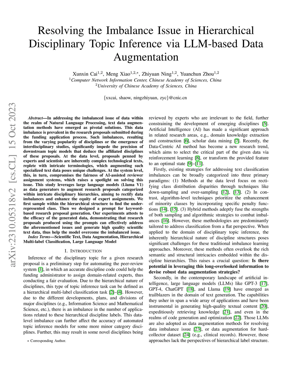 In addressing the imbalanced issue of data within the realm of Natural Language Processing, text data augmentation methods have emerged as pivotal solutions. This data imbalance is prevalent in the research proposals submitted during the funding application process. Such imbalances, resulting from the varying popularity of disciplines or the emergence of interdisciplinary studies, significantly impede the precision of downstream topic models that deduce the affiliated disciplines of these proposals. At the data level, proposals penned by experts and scientists are inherently complex technological texts, replete with intricate terminologies, which augmenting such specialized text data poses unique challenges. At the system level, this, in turn, compromises the fairness of AI-assisted reviewer assignment systems, which raises a spotlight on solving this issue. This study leverages large language models (Llama V1) as data generators to augment research proposals categorized within intricate disciplinary hierarchies, aiming to rectify data imbalances and enhance the equity of expert assignments. We first sample within the hierarchical structure to find the under-represented class. Then we designed a prompt for keyword-based research proposal generation. Our experiments attests to the efficacy of the generated data, demonstrating that research proposals produced using the prompts can effectively address the aforementioned issues and generate high quality scientific text data, thus help the model overcome the imbalanced issue.