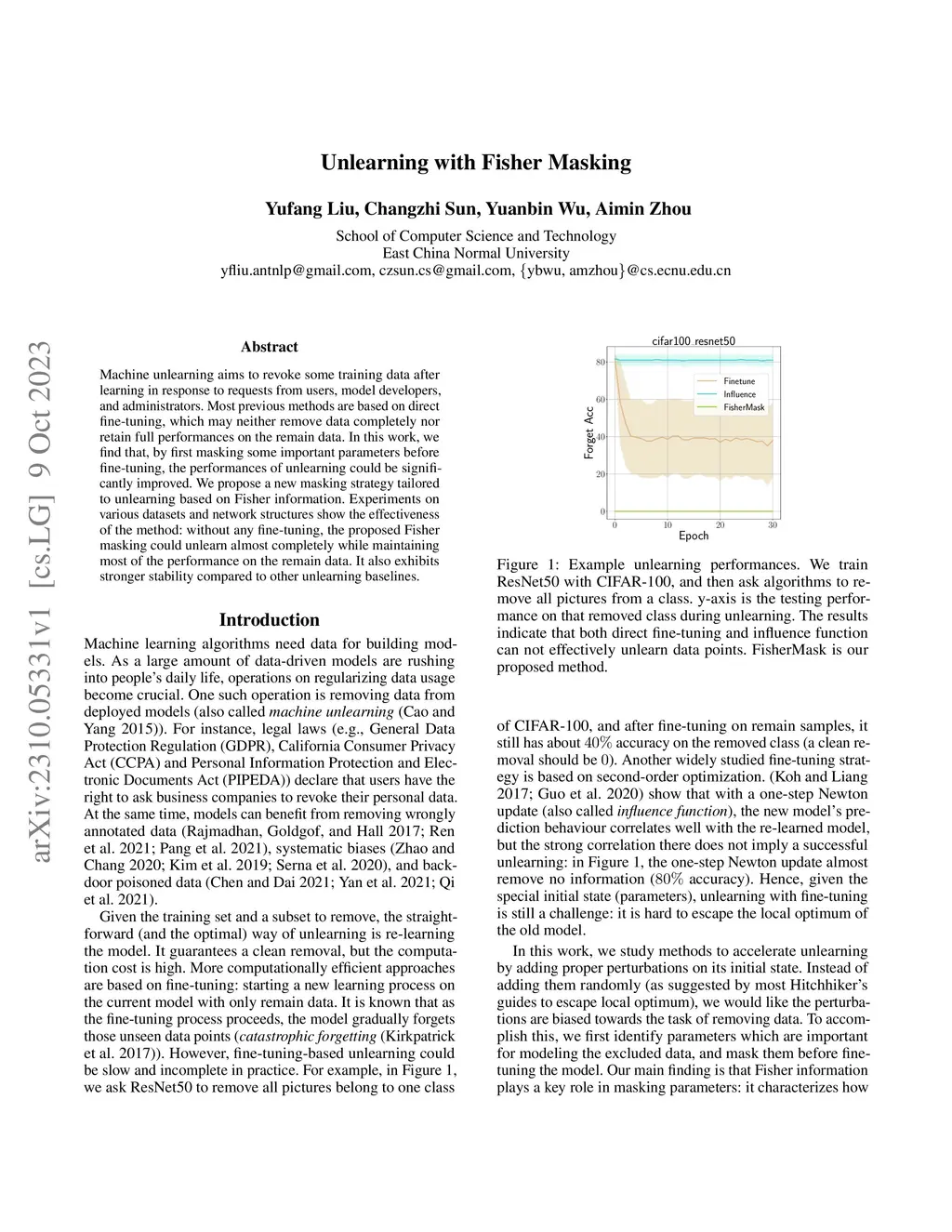 Machine unlearning aims to revoke some training data after learning in response to requests from users, model developers, and administrators. Most previous methods are based on direct fine-tuning, which may neither remove data completely nor retain full performances on the remain data. In this work, we find that, by first masking some important parameters before fine-tuning, the performances of unlearning could be significantly improved. We propose a new masking strategy tailored to unlearning based on Fisher information. Experiments on various datasets and network structures show the effectiveness of the method: without any fine-tuning, the proposed Fisher masking could unlearn almost completely while maintaining most of the performance on the remain data. It also exhibits stronger stability compared to other unlearning baselines