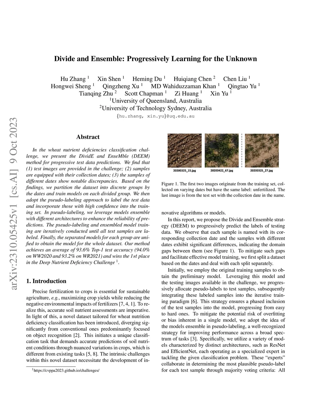 In the wheat nutrient deficiencies classification challenge, we present the DividE and EnseMble (DEEM) method for progressive test data predictions. We find that (1) test images are provided in the challenge; (2) samples are equipped with their collection dates; (3) the samples of different dates show notable discrepancies. Based on the findings, we partition the dataset into discrete groups by the dates and train models on each divided group. We then adopt the pseudo-labeling approach to label the test data and incorporate those with high confidence into the training set. In pseudo-labeling, we leverage models ensemble with different architectures to enhance the reliability of predictions. The pseudo-labeling and ensembled model training are iteratively conducted until all test samples are labeled. Finally, the separated models for each group are unified to obtain the model for the whole dataset. Our method achieves an average of 93.6\% Top-1 test accuracy~(94.0\% on WW2020 and 93.2\% on WR2021) and wins the 1 place in the Deep Nutrient Deficiency Challenge~\footnote{https://cvppa2023.github.io/challenges/}.