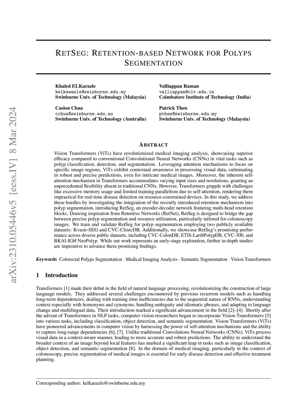 Vision Transformers (ViTs) have revolutionized medical imaging analysis, showcasing superior efficacy compared to conventional Convolutional Neural Networks (CNNs) in vital tasks such as polyp classification, detection, and segmentation. Leveraging attention mechanisms to focus on specific image regions, ViTs exhibit contextual awareness in processing visual data, culminating in robust and precise predictions, even for intricate medical images. Moreover, the inherent self-attention mechanism in Transformers accommodates varying input sizes and resolutions, granting an unprecedented flexibility absent in traditional CNNs. However, Transformers grapple with challenges like excessive memory usage and limited training parallelism due to self-attention, rendering them impractical for real-time disease detection on resource-constrained devices. In this study, we address these hurdles by investigating the integration of the recently introduced retention mechanism into polyp segmentation, introducing RetSeg, an encoder-decoder network featuring multi-head retention blocks. Drawing inspiration from Retentive Networks (RetNet), RetSeg is designed to bridge the gap between precise polyp segmentation and resource utilization, particularly tailored for colonoscopy images. We train and validate RetSeg for polyp segmentation employing two publicly available datasets: Kvasir-SEG and CVC-ClinicDB. Additionally, we showcase RetSeg's promising performance across diverse public datasets, including CVC-ColonDB, ETIS-LaribPolypDB, CVC-300, and BKAI-IGH NeoPolyp. While our work represents an early-stage exploration, further in-depth studies are imperative to advance these promising findings.
