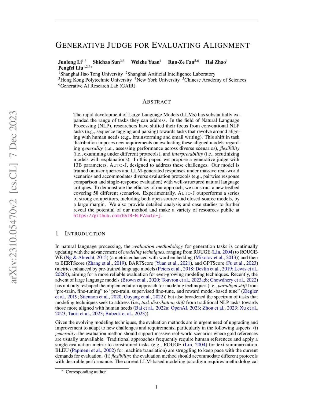 The rapid development of Large Language Models (LLMs) has substantially expanded the range of tasks they can address. In the field of Natural Language Processing (NLP), researchers have shifted their focus from conventional NLP tasks (e.g., sequence tagging and parsing) towards tasks that revolve around aligning with human needs (e.g., brainstorming and email writing). This shift in task distribution imposes new requirements on evaluating these aligned models regarding generality (i.e., assessing performance across diverse scenarios), flexibility (i.e., examining under different protocols), and interpretability (i.e., scrutinizing models with explanations). In this paper, we propose a generative judge with 13B parameters, Auto-J, designed to address these challenges. Our model is trained on user queries and LLM-generated responses under massive real-world scenarios and accommodates diverse evaluation protocols (e.g., pairwise response comparison and single-response evaluation) with well-structured natural language critiques. To demonstrate the efficacy of our approach, we construct a new testbed covering 58 different scenarios. Experimentally, Auto-J outperforms a series of strong competitors, including both open-source and closed-source models, by a large margin. We also provide detailed analysis and case studies to further reveal the potential of our method and make a variety of resources public at https://github.com/GAIR-NLP/auto-j.