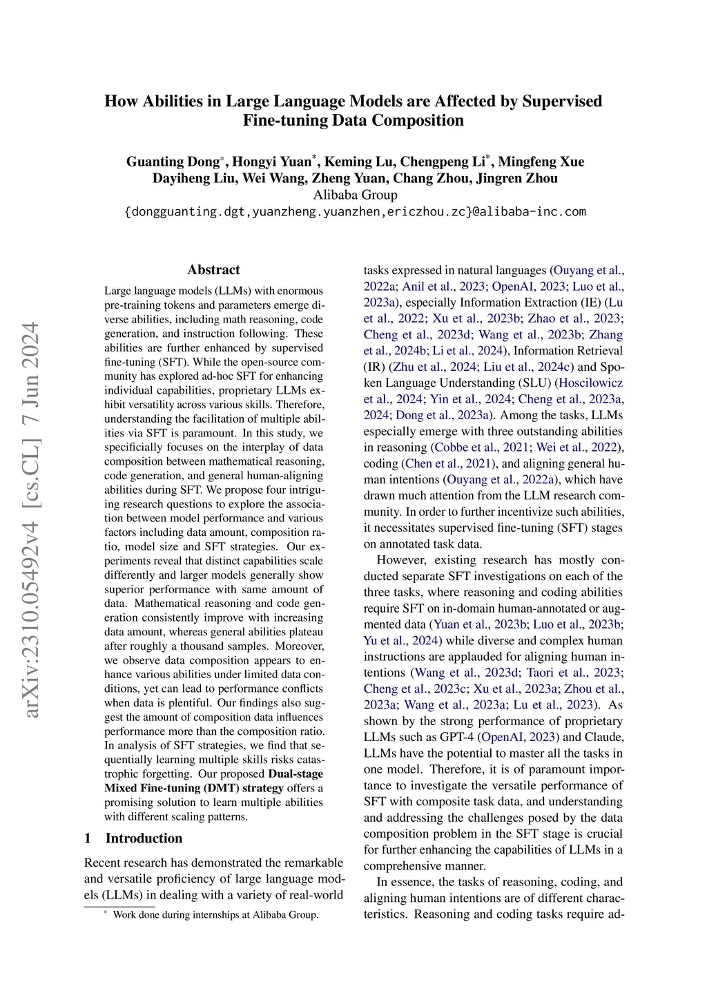 Large language models (LLMs) with enormous pre-training tokens and parameters emerge diverse abilities, including math reasoning, code generation, and instruction following. These abilities are further enhanced by supervised fine-tuning (SFT). While the open-source community has explored ad-hoc SFT for enhancing individual capabilities, proprietary LLMs exhibit versatility across various skills. Therefore, understanding the facilitation of multiple abilities via SFT is paramount. In this study, we specifically focuses on the interplay of data composition between mathematical reasoning, code generation, and general human-aligning abilities during SFT. We propose four intriguing research questions to explore the association between model performance and various factors including data amount, composition ratio, model size and SFT strategies. Our experiments reveal that distinct capabilities scale differently and larger models generally show superior performance with same amount of data. Mathematical reasoning and code generation consistently improve with increasing data amount, whereas general abilities plateau after roughly a thousand samples. Moreover, we observe data composition appears to enhance various abilities under limited data conditions, yet can lead to performance conflicts when data is plentiful. Our findings also suggest the amount of composition data influences performance more than the composition ratio. In analysis of SFT strategies, we find that sequentially learning multiple skills risks catastrophic forgetting. Our proposed Dual-stage Mixed Fine-tuning (DMT) strategy offers a promising solution to learn multiple abilities with different scaling patterns.