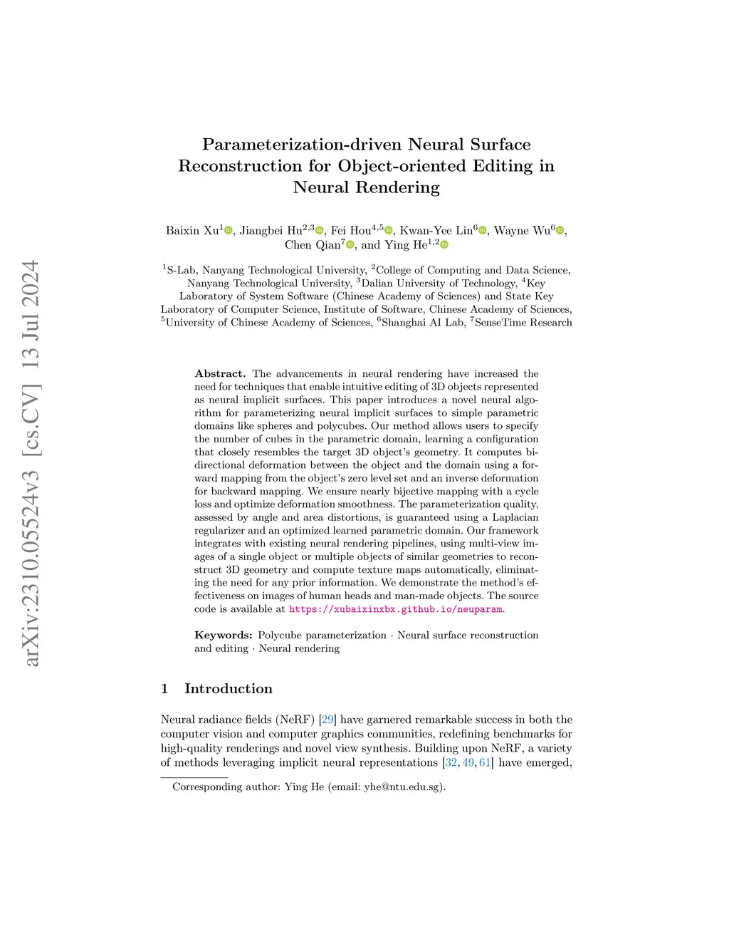 The advancements in neural rendering have increased the need for techniques that enable intuitive editing of 3D objects represented as neural implicit surfaces. This paper introduces a novel neural algorithm for parameterizing neural implicit surfaces to simple parametric domains like spheres and polycubes. Our method allows users to specify the number of cubes in the parametric domain, learning a configuration that closely resembles the target 3D object's geometry. It computes bi-directional deformation between the object and the domain using a forward mapping from the object's zero level set and an inverse deformation for backward mapping. We ensure nearly bijective mapping with a cycle loss and optimize deformation smoothness. The parameterization quality, assessed by angle and area distortions, is guaranteed using a Laplacian regularizer and an optimized learned parametric domain. Our framework integrates with existing neural rendering pipelines, using multi-view images of a single object or multiple objects of similar geometries to reconstruct 3D geometry and compute texture maps automatically, eliminating the need for any prior information. We demonstrate the method's effectiveness on images of human heads and man-made objects.