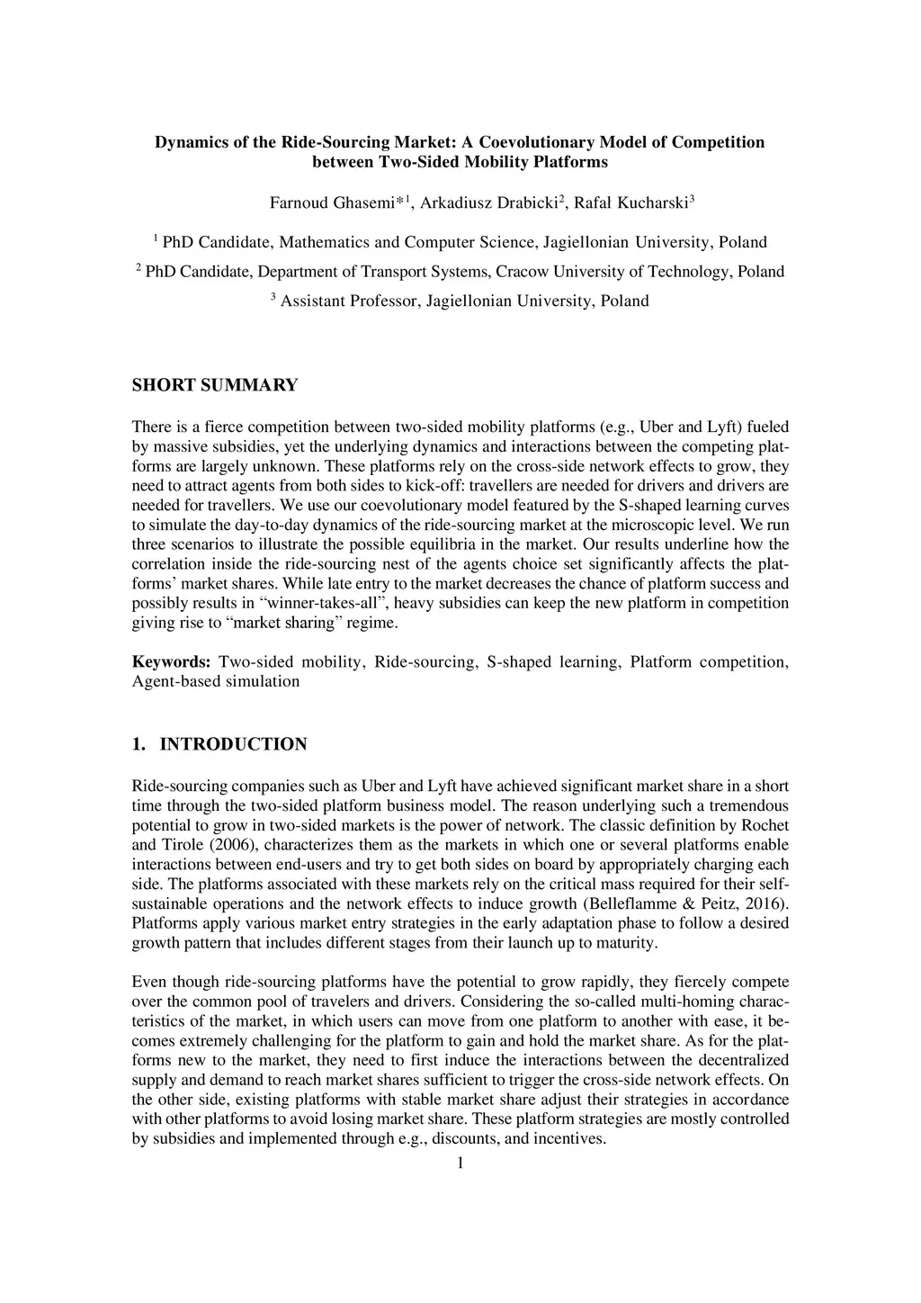 There is a fierce competition between two-sided mobility platforms (e.g., Uber and Lyft) fueled by massive subsidies, yet the underlying dynamics and interactions between the competing plat-forms are largely unknown. These platforms rely on the cross-side network effects to grow, they need to attract agents from both sides to kick-off: travellers are needed for drivers and drivers are needed for travellers. We use our coevolutionary model featured by the S-shaped learning curves to simulate the day-to-day dynamics of the ride-sourcing market at the microscopic level. We run three scenarios to illustrate the possible equilibria in the market. Our results underline how the correlation inside the ride-sourcing nest of the agents choice set significantly affects the plat-forms' market shares. While late entry to the market decreases the chance of platform success and possibly results in "winner-takes-all", heavy subsidies can keep the new platform in competition giving rise to "market sharing" regime.