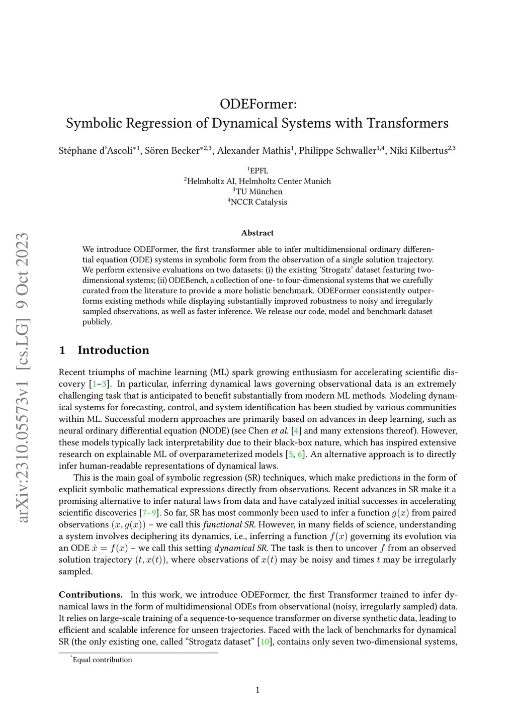 We introduce ODEFormer, the first transformer able to infer multidimensional ordinary differential equation (ODE) systems in symbolic form from the observation of a single solution trajectory. We perform extensive evaluations on two datasets: (i) the existing "Strogatz" dataset featuring two-dimensional systems; (ii) ODEBench, a collection of one- to four-dimensional systems that we carefully curated from the literature to provide a more holistic benchmark. ODEFormer consistently outperforms existing methods while displaying substantially improved robustness to noisy and irregularly sampled observations, as well as faster inference. We release our code, model and benchmark dataset publicly.