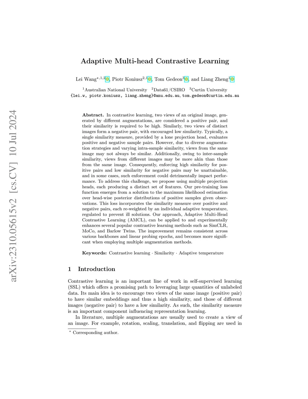 Adaptive Multi-head Contrastive Learning