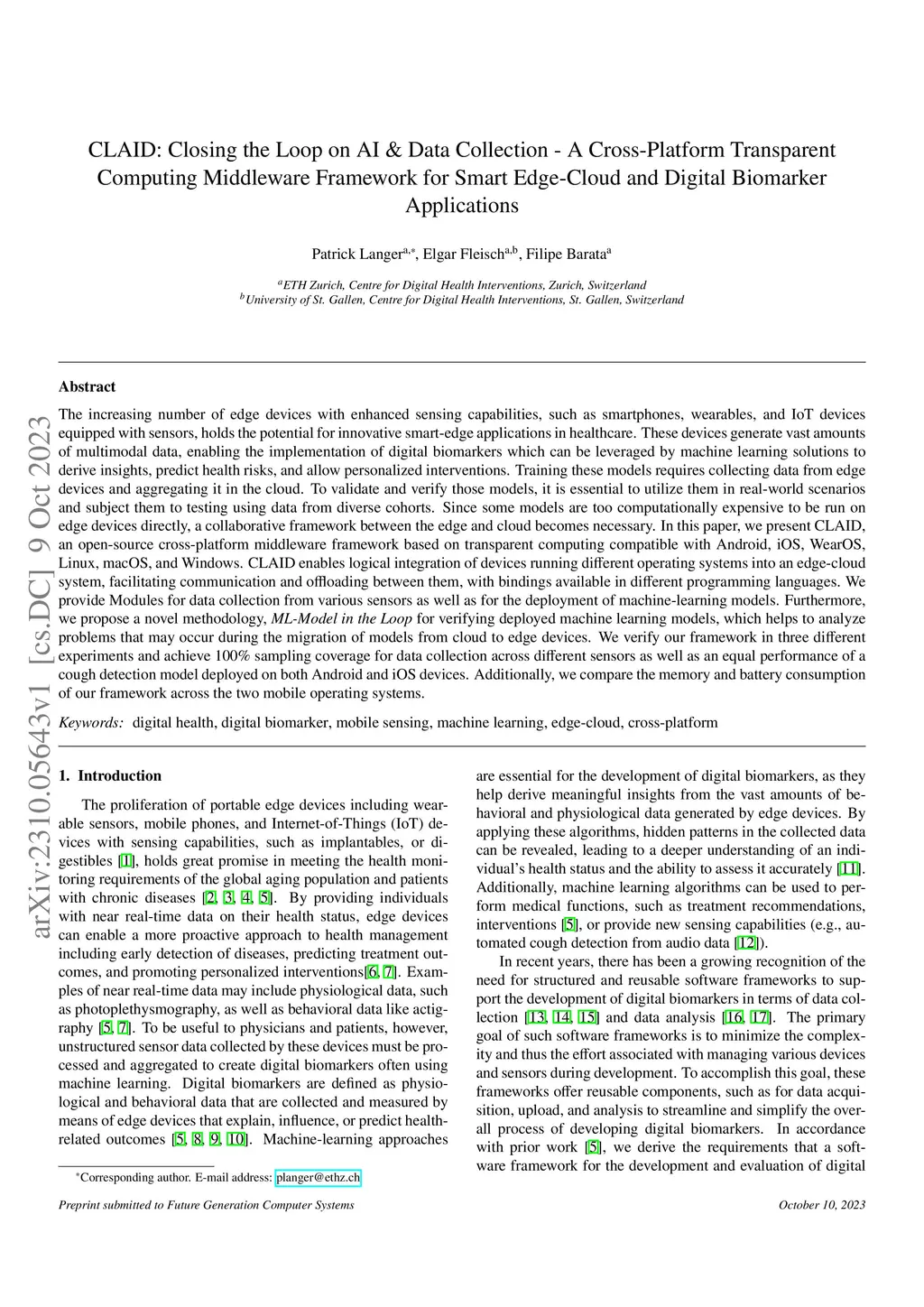 The increasing number of edge devices with enhanced sensing capabilities, such as smartphones, wearables, and IoT devices equipped with sensors, holds the potential for innovative smart-edge applications in healthcare. These devices generate vast amounts of multimodal data, enabling the implementation of digital biomarkers which can be leveraged by machine learning solutions to derive insights, predict health risks, and allow personalized interventions. Training these models requires collecting data from edge devices and aggregating it in the cloud. To validate and verify those models, it is essential to utilize them in real-world scenarios and subject them to testing using data from diverse cohorts. Since some models are too computationally expensive to be run on edge devices directly, a collaborative framework between the edge and cloud becomes necessary. In this paper, we present CLAID, an open-source cross-platform middleware framework based on transparent computing compatible with Android, iOS, WearOS, Linux, macOS, and Windows. CLAID enables logical integration of devices running different operating systems into an edge-cloud system, facilitating communication and offloading between them, with bindings available in different programming languages. We provide Modules for data collection from various sensors as well as for the deployment of machine-learning models. Furthermore, we propose a novel methodology, "ML-Model in the Loop" for verifying deployed machine learning models, which helps to analyze problems that may occur during the migration of models from cloud to edge devices. We verify our framework in three different experiments and achieve 100% sampling coverage for data collection across different sensors as well as an equal performance of a cough detection model deployed on both Android and iOS devices. We evaluate the memory and battery consumption of our framework.