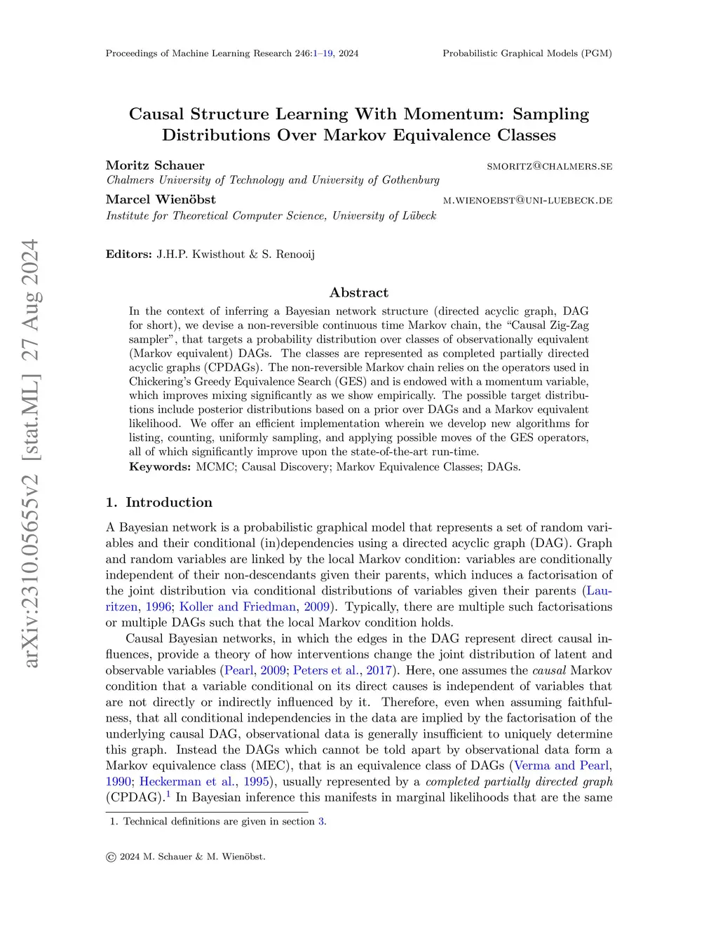 In the context of inferring a Bayesian network structure (directed acyclic graph, DAG for short), we devise a non-reversible continuous time Markov chain, the "Causal Zig-Zag sampler", that targets a probability distribution over classes of observationally equivalent (Markov equivalent) DAGs. The classes are represented as completed partially directed acyclic graphs (CPDAGs). The non-reversible Markov chain relies on the operators used in Chickering's Greedy Equivalence Search (GES) and is endowed with a momentum variable, which improves mixing significantly as we show empirically. The possible target distributions include posterior distributions based on a prior over DAGs and a Markov equivalent likelihood. We offer an efficient implementation wherein we develop new algorithms for listing, counting, uniformly sampling, and applying possible moves of the GES operators, all of which significantly improve upon the state-of-the-art.