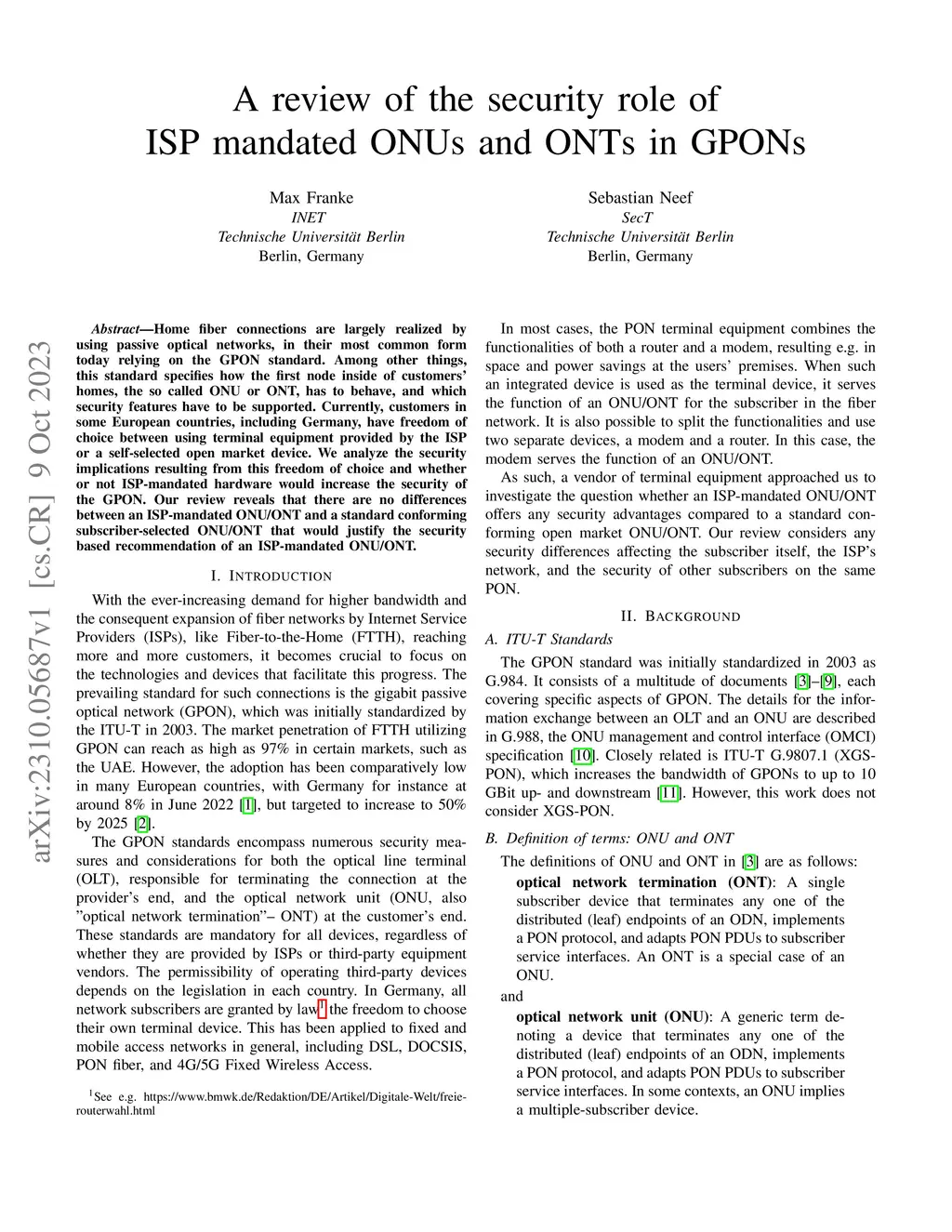 Home fiber connections are largely realized by using passive optical networks, in their most common form today relying on the GPON standard. Among other things, this standard specifies how the first node inside of customers' homes, the so called ONU or ONT, has to behave, and which security features have to be supported. Currently, customers in some European countries, including Germany, have freedom of choice between using terminal equipment provided by the ISP or a self-selected open market device.We analyze the security implications resulting from this freedom of choice and whether or not ISP-mandated hardware would increase the security of the GPON. Our review reveals that there are no differences between an ISP-mandated ONU/ONT and a standard conforming subscriber-selected ONU/ONT that would justify the security based recommendation of an ISP-mandated ONU/ONT.