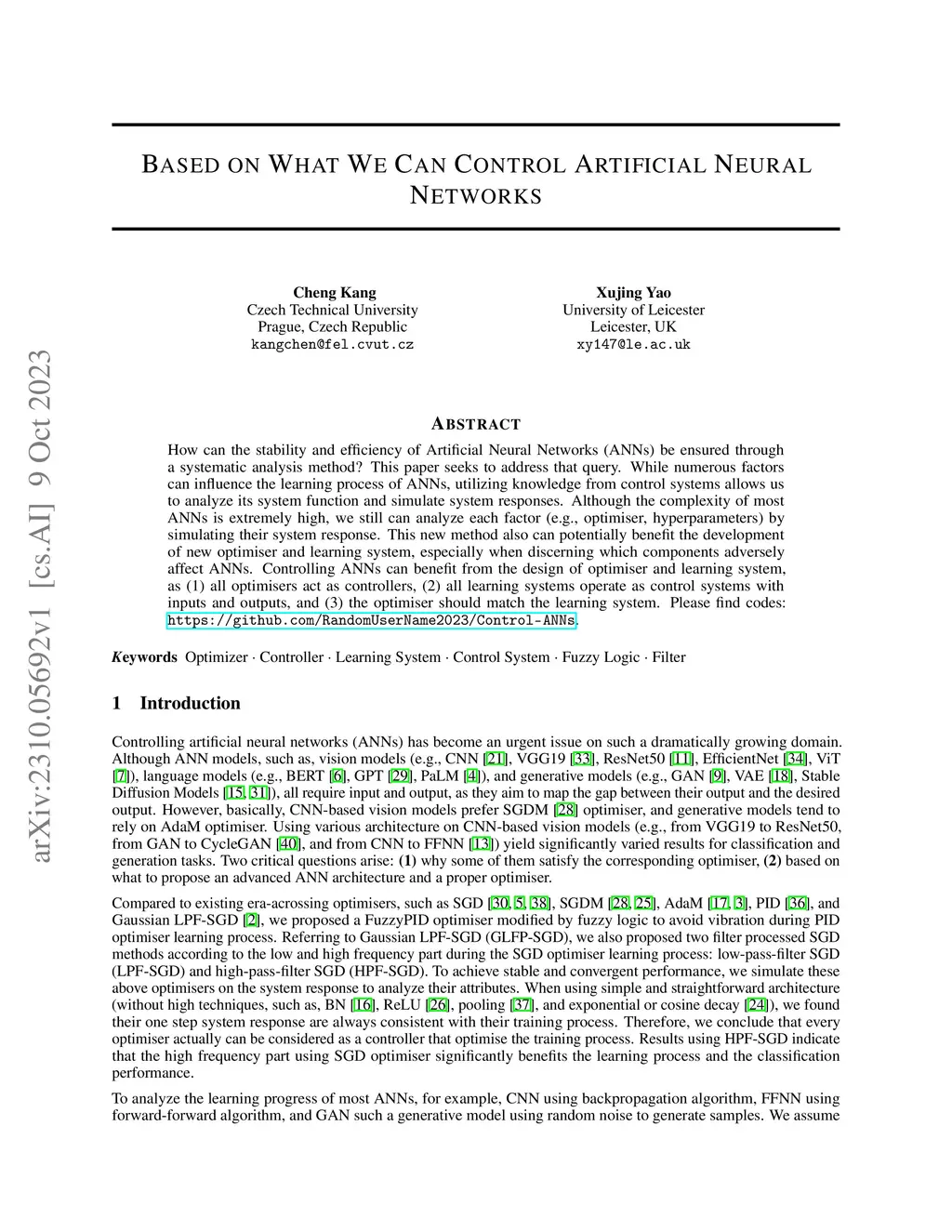 How can the stability and efficiency of Artificial Neural Networks (ANNs) be ensured through a systematic analysis method? This paper seeks to address that query. While numerous factors can influence the learning process of ANNs, utilizing knowledge from control systems allows us to analyze its system function and simulate system responses. Although the complexity of most ANNs is extremely high, we still can analyze each factor (e.g., optimiser, hyperparameters) by simulating their system response. This new method also can potentially benefit the development of new optimiser and learning system, especially when discerning which components adversely affect ANNs. Controlling ANNs can benefit from the design of optimiser and learning system, as (1) all optimisers act as controllers, (2) all learning systems operate as control systems with inputs and outputs, and (3) the optimiser should match the learning system. Please find codes: \url{https://github.com/RandomUserName2023/Control-ANNs}.