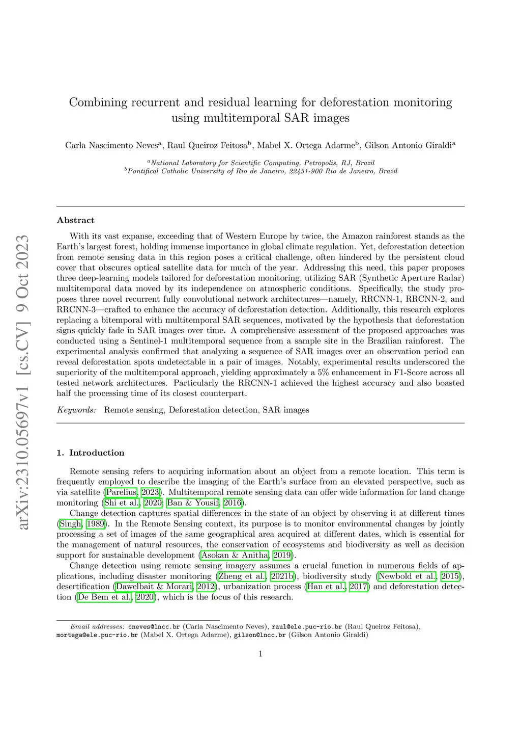 Combining recurrent and residual learning for deforestation monitoring