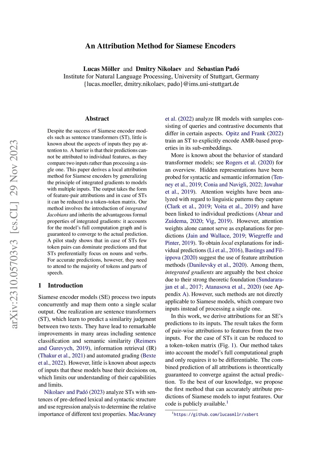 Despite the success of Siamese encoder models such as sentence transformers (ST), little is known about the aspects of inputs they pay attention to. A barrier is that their predictions cannot be attributed to individual features, as they compare two inputs rather than processing a single one. This paper derives a local attribution method for Siamese encoders by generalizing the principle of integrated gradients to models with multiple inputs. The solution takes the form of feature-pair attributions, and can be reduced to a token-token matrix for STs. Our method involves the introduction of integrated Jacobians and inherits the advantageous formal properties of integrated gradients: it accounts for the model's full computation graph and is guaranteed to converge to the actual prediction. A pilot study shows that in an ST few token-pairs can often explain large fractions of predictions, and it focuses on nouns and verbs. For accurate predictions, it however needs to attend to the majority of tokens and parts of speech.