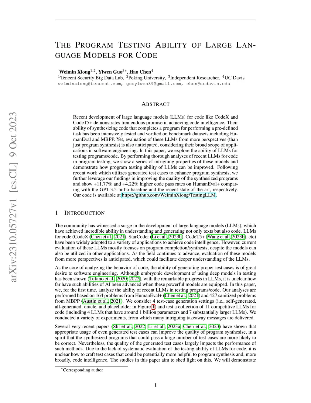 Recent development of large language models (LLMs) for code like CodeX and CodeT5+ demonstrates tremendous promise in achieving code intelligence. Their ability of synthesizing code that completes a program for performing a pre-defined task has been intensively tested and verified on benchmark datasets including HumanEval and MBPP. Yet, evaluation of these LLMs from more perspectives (than just program synthesis) is also anticipated, considering their broad scope of applications in software engineering. In this paper, we explore the ability of LLMs for testing programs/code. By performing thorough analyses of recent LLMs for code in program testing, we show a series of intriguing properties of these models and demonstrate how program testing ability of LLMs can be improved. Following recent work which utilizes generated test cases to enhance program synthesis, we further leverage our findings in improving the quality of the synthesized programs and show +11.77% and +4.22% higher code pass rates on HumanEval+ comparing with the GPT-3.5-turbo baseline and the recent state-of-the-art, respectively.