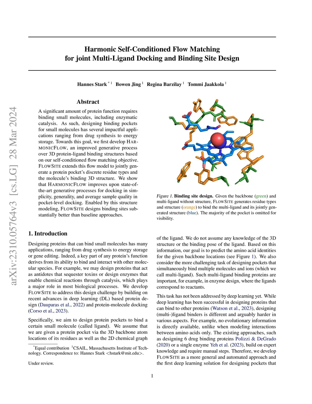 A significant amount of protein function requires binding small molecules, including enzymatic catalysis. As such, designing binding pockets for small molecules has several impactful applications ranging from drug synthesis to energy storage. Towards this goal, we first develop HarmonicFlow, an improved generative process over 3D protein-ligand binding structures based on our self-conditioned flow matching objective. FlowSite extends this flow model to jointly generate a protein pocket's discrete residue types and the molecule's binding 3D structure. We show that HarmonicFlow improves upon state-of-the-art generative processes for docking in simplicity, generality, and average sample quality in pocket-level docking. Enabled by this structure modeling, FlowSite designs binding sites substantially better than baseline approaches.