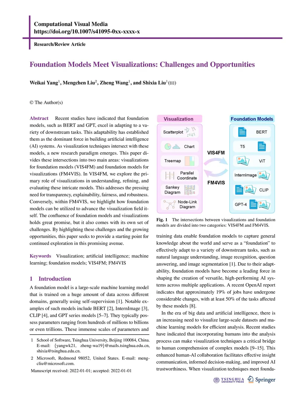 Recent studies have indicated that foundation models, such as BERT and GPT, excel in adapting to a variety of downstream tasks. This adaptability has established them as the dominant force in building artificial intelligence (AI) systems. As visualization techniques intersect with these models, a new research paradigm emerges. This paper divides these intersections into two main areas: visualizations for foundation models (VIS4FM) and foundation models for visualizations (FM4VIS). In VIS4FM, we explore the primary role of visualizations in understanding, refining, and evaluating these intricate models. This addresses the pressing need for transparency, explainability, fairness, and robustness. Conversely, within FM4VIS, we highlight how foundation models can be utilized to advance the visualization field itself. The confluence of foundation models and visualizations holds great promise, but it also comes with its own set of challenges. By highlighting these challenges and the growing opportunities, this paper seeks to provide a starting point for continued exploration in this promising avenue.