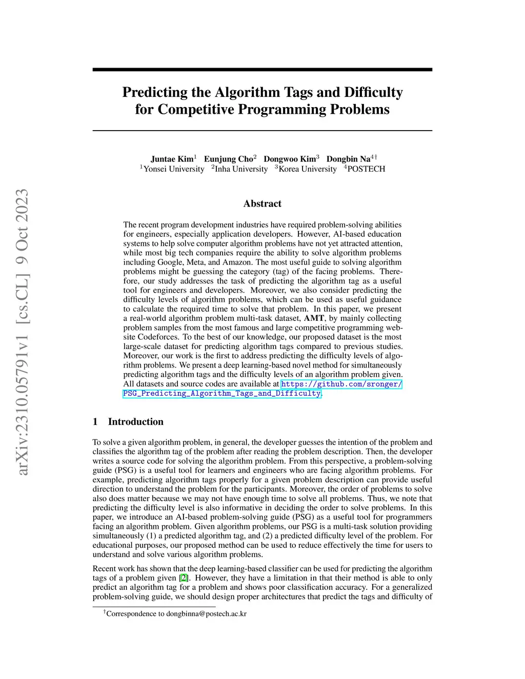 The recent program development industries have required problem-solving abilities for engineers, especially application developers. However, AI-based education systems to help solve computer algorithm problems have not yet attracted attention, while most big tech companies require the ability to solve algorithm problems including Google, Meta, and Amazon. The most useful guide to solving algorithm problems might be guessing the category (tag) of the facing problems. Therefore, our study addresses the task of predicting the algorithm tag as a useful tool for engineers and developers. Moreover, we also consider predicting the difficulty levels of algorithm problems, which can be used as useful guidance to calculate the required time to solve that problem. In this paper, we present a real-world algorithm problem multi-task dataset, AMT, by mainly collecting problem samples from the most famous and large competitive programming website Codeforces. To the best of our knowledge, our proposed dataset is the most large-scale dataset for predicting algorithm tags compared to previous studies. Moreover, our work is the first to address predicting the difficulty levels of algorithm problems. We present a deep learning-based novel method for simultaneously predicting algorithm tags and the difficulty levels of an algorithm problem given. All datasets and source codes are available at https://github.com/sronger/PSG_Predicting_Algorithm_Tags_and_Difficulty.