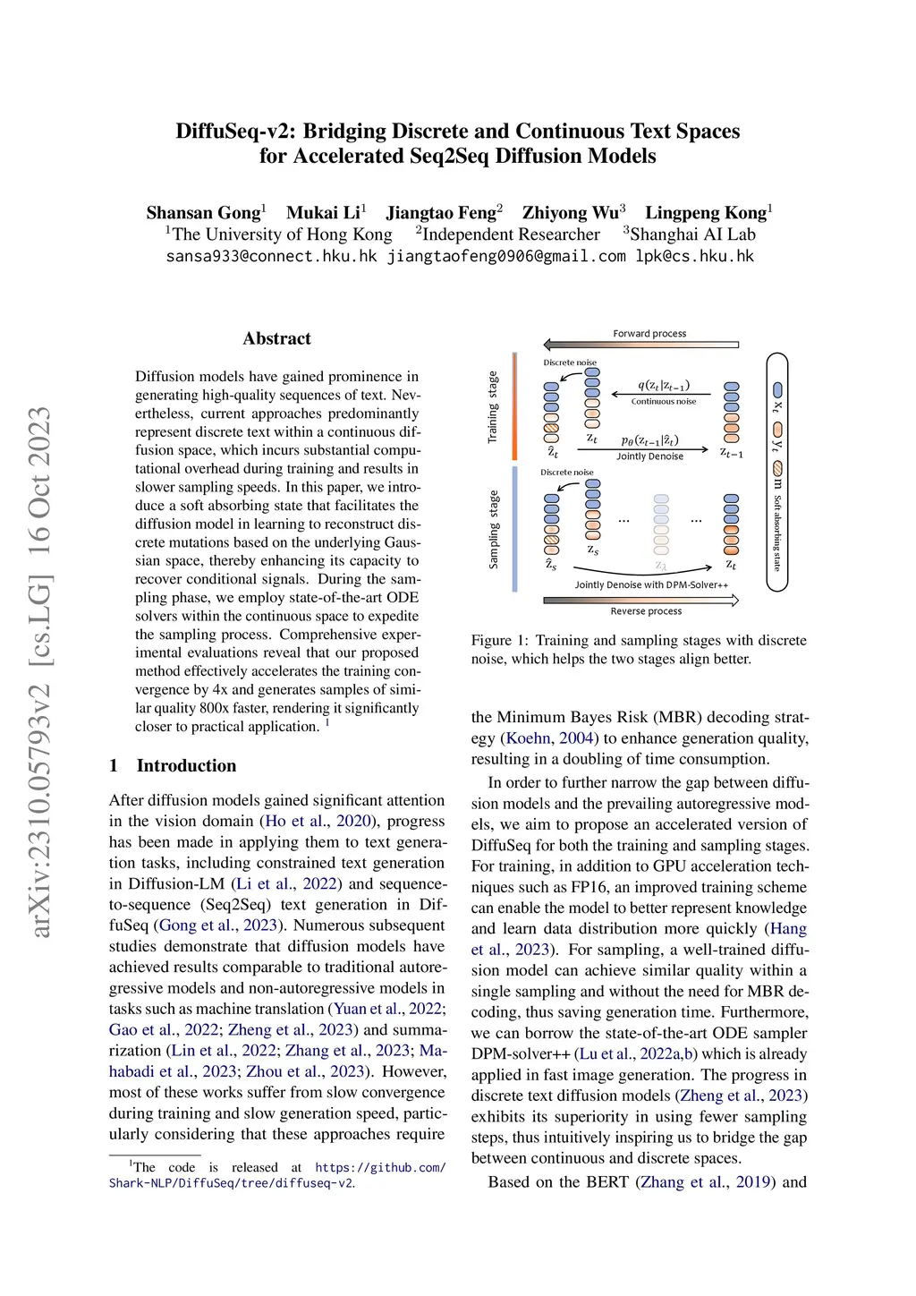 Diffusion models have gained prominence in generating high-quality sequences of text. Nevertheless, current approaches predominantly represent discrete text within a continuous diffusion space, which incurs substantial computational overhead during training and results in slower sampling speeds. In this paper, we introduce a soft absorbing state that facilitates the diffusion model in learning to reconstruct discrete mutations based on the underlying Gaussian space, thereby enhancing its capacity to recover conditional signals. During the sampling phase, we employ state-of-the-art ODE solvers within the continuous space to expedite the sampling process. Comprehensive experimental evaluations reveal that our proposed method effectively accelerates the training convergence by 4x and generates samples of similar quality 800x faster, rendering it significantly closer to practical application. \footnote{The code is released at \url{https://github.com/Shark-NLP/DiffuSeq}