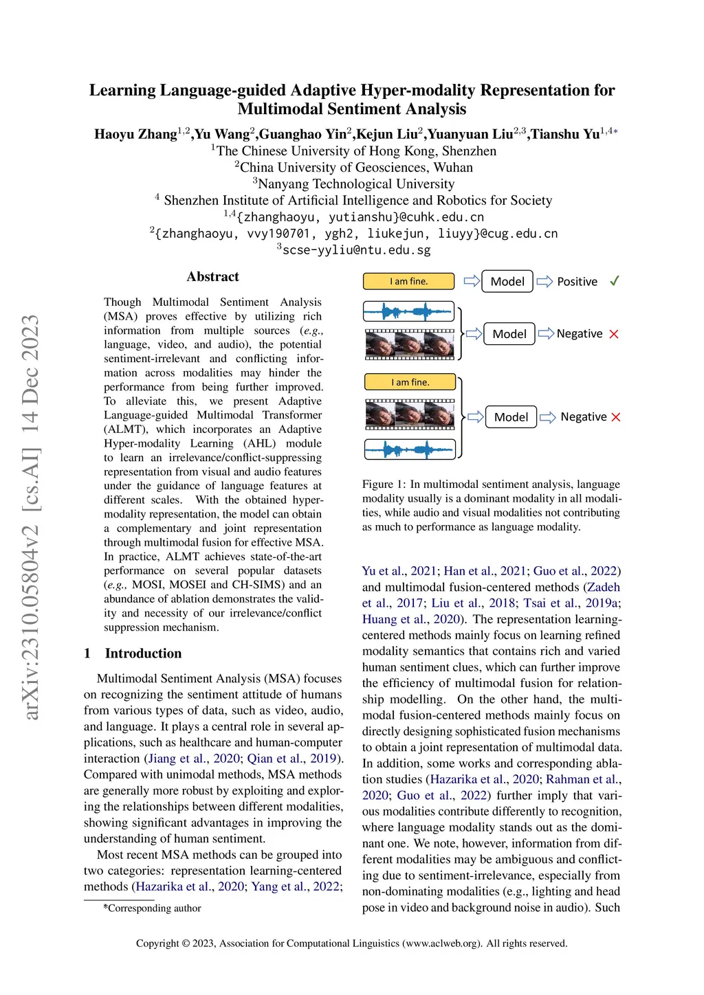 Though Multimodal Sentiment Analysis (MSA) proves effective by utilizing rich information from multiple sources (e.g., language, video, and audio), the potential sentiment-irrelevant and conflicting information across modalities may hinder the performance from being further improved. To alleviate this, we present Adaptive Language-guided Multimodal Transformer (ALMT), which incorporates an Adaptive Hyper-modality Learning (AHL) module to learn an irrelevance/conflict-suppressing representation from visual and audio features under the guidance of language features at different scales. With the obtained hyper-modality representation, the model can obtain a complementary and joint representation through multimodal fusion for effective MSA. In practice, ALMT achieves state-of-the-art performance on several popular datasets (e.g., MOSI, MOSEI and CH-SIMS) and an abundance of ablation demonstrates the validity and necessity of our irrelevance/conflict suppression mechanism.