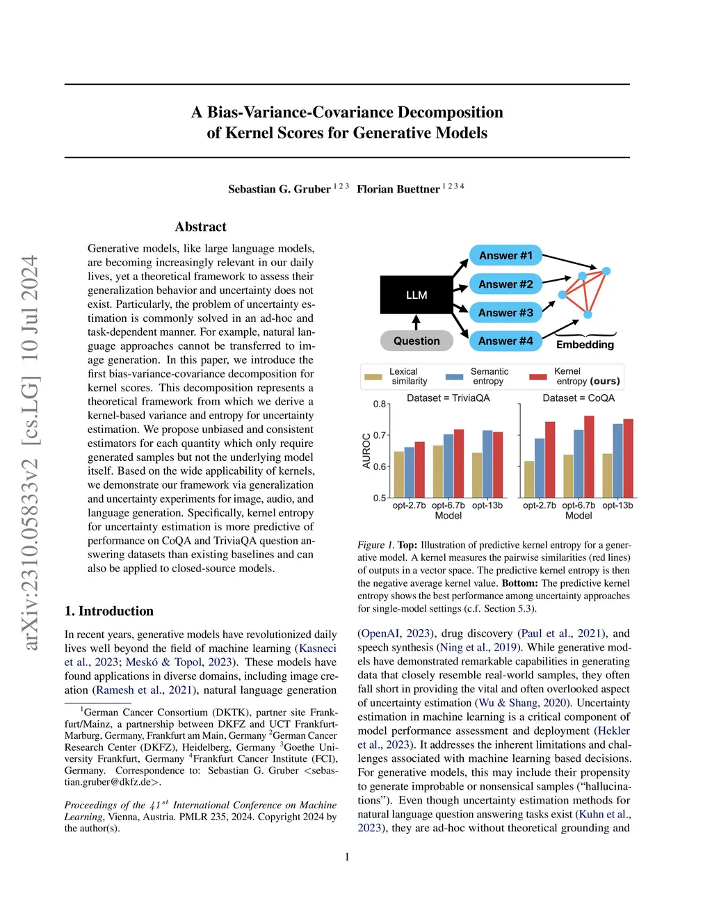 Generative models, like large language models, are becoming increasingly relevant in our daily lives, yet a theoretical framework to assess their generalization behavior and uncertainty does not exist. Particularly, the problem of uncertainty estimation is commonly solved in an ad-hoc and task-dependent manner. For example, natural language approaches cannot be transferred to image generation. In this paper, we introduce the first bias-variance-covariance decomposition for kernel scores. This decomposition represents a theoretical framework from which we derive a kernel-based variance and entropy for uncertainty estimation. We propose unbiased and consistent estimators for each quantity which only require generated samples but not the underlying model itself. Based on the wide applicability of kernels, we demonstrate our framework via generalization and uncertainty experiments for image, audio, and language generation. Specifically, kernel entropy for uncertainty estimation is more predictive of performance on CoQA and TriviaQA question answering datasets than existing baselines and can also be applied to closed-source models.