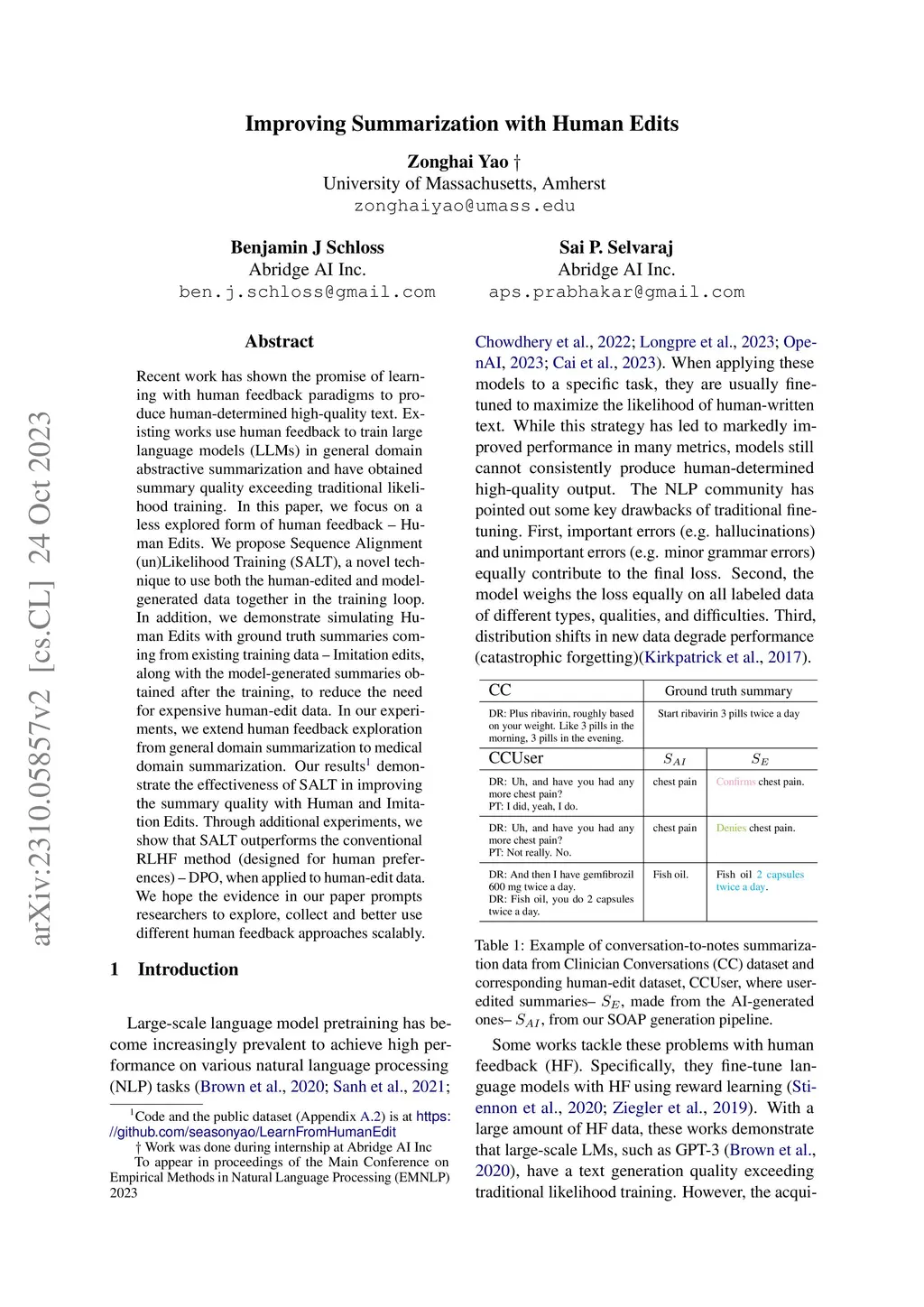 Recent work has shown the promise of learning with human feedback paradigms to produce human-determined high-quality text. Existing works use human feedback to train large language models (LLMs) in general domain abstractive summarization and have obtained summary quality exceeding traditional likelihood training. In this paper, we focus on a less explored form of human feedback -- Human Edits. We propose Sequence Alignment (un)Likelihood Training (SALT), a novel technique to use both the human-edited and model-generated data together in the training loop. In addition, we demonstrate simulating Human Edits with ground truth summaries coming from existing training data -- Imitation edits, along with the model-generated summaries obtained after the training, to reduce the need for expensive human-edit data. In our experiments, we extend human feedback exploration from general domain summarization to medical domain summarization. Our results demonstrate the effectiveness of SALT in improving the summary quality with Human and Imitation Edits. Through additional experiments, we show that SALT outperforms the conventional RLHF method (designed for human preferences) -- DPO, when applied to human-edit data. We hope the evidence in our paper prompts researchers to explore, collect, and better use different human feedback approaches scalably.