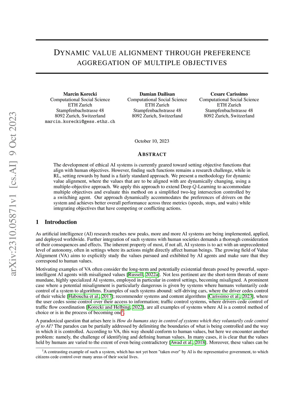 The development of ethical AI systems is currently geared toward setting objective functions that align with human objectives. However, finding such functions remains a research challenge, while in RL, setting rewards by hand is a fairly standard approach. We present a methodology for dynamic value alignment, where the values that are to be aligned with are dynamically changing, using a multiple-objective approach. We apply this approach to extend Deep -Learning to accommodate multiple objectives and evaluate this method on a simplified two-leg intersection controlled by a switching agent.Our approach dynamically accommodates the preferences of drivers on the system and achieves better overall performance across three metrics (speeds, stops, and waits) while integrating objectives that have competing or conflicting actions.