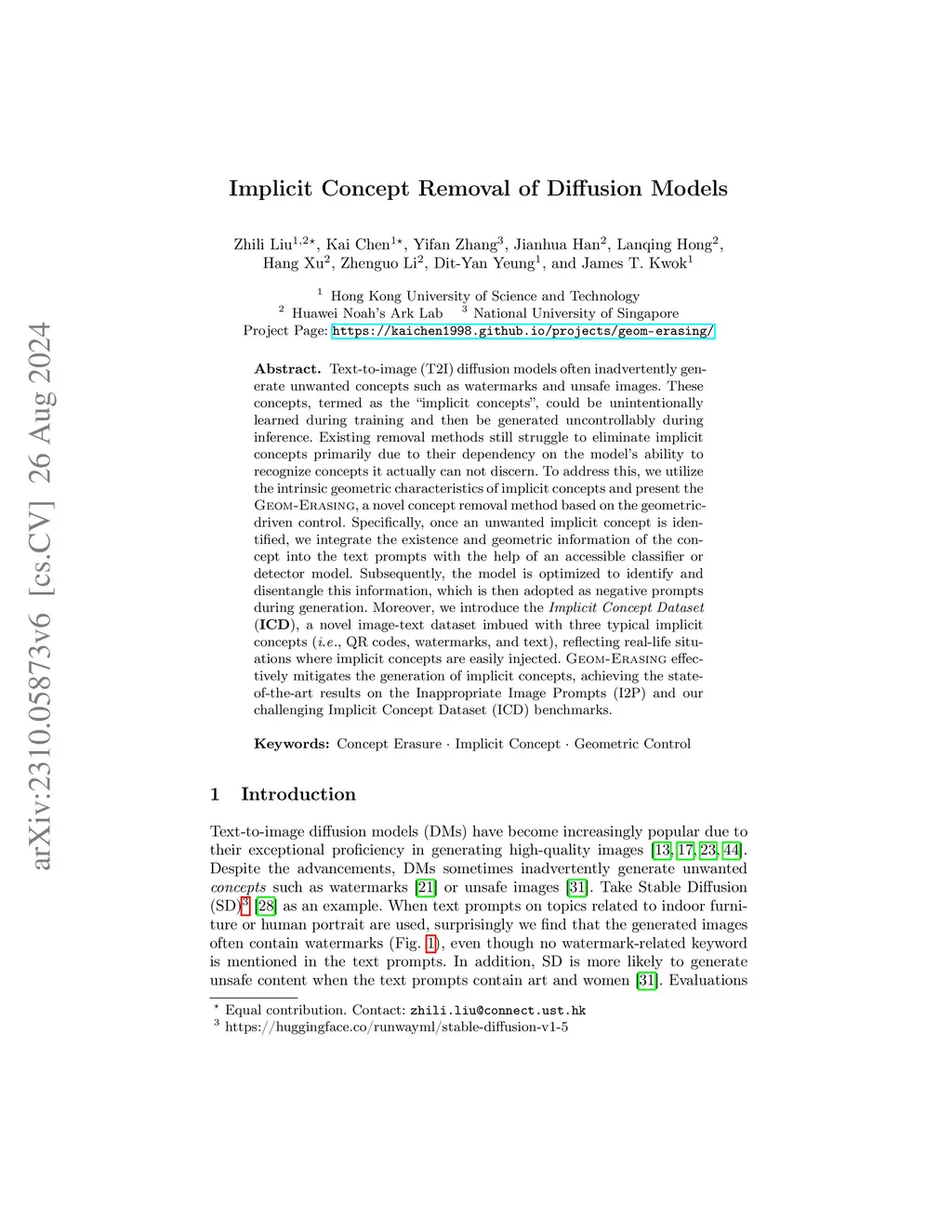 Text-to-image (T2I) diffusion models often inadvertently generate unwanted concepts such as watermarks and unsafe images. These concepts, termed as the "implicit concepts", could be unintentionally learned during training and then be generated uncontrollably during inference. Existing removal methods still struggle to eliminate implicit concepts primarily due to their dependency on the model's ability to recognize concepts it actually can not discern. To address this, we utilize the intrinsic geometric characteristics of implicit concepts and present the Geom-Erasing, a novel concept removal method based on the geometric-driven control. Specifically, once an unwanted implicit concept is identified, we integrate the existence and geometric information of the concept into the text prompts with the help of an accessible classifier or detector model. Subsequently, the model is optimized to identify and disentangle this information, which is then adopted as negative prompts during generation. Moreover, we introduce the Implicit Concept Dataset (ICD), a novel image-text dataset imbued with three typical implicit concepts (i.e., QR codes, watermarks, and text), reflecting real-life situations where implicit concepts are easily injected. Geom-Erasing effectively mitigates the generation of implicit concepts, achieving the state-of-the-art results on the Inappropriate Image Prompts (I2P) and our challenging Implicit Concept Dataset (ICD) benchmarks.