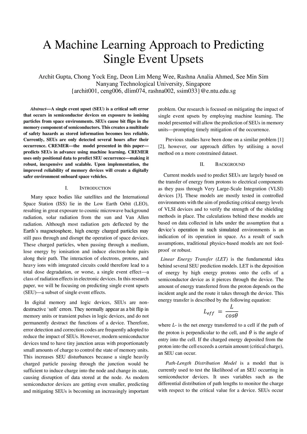 A single event upset (SEU) is a critical soft error that occurs in semiconductor devices on exposure to ionising particles from space environments. SEUs cause bit flips in the memory component of semiconductors. This creates a multitude of safety hazards as stored information becomes less reliable. Currently, SEUs are only detected several hours after their occurrence. CREMER, the model presented in this paper, predicts SEUs in advance using machine learning. CREMER uses only positional data to predict SEU occurrence, making it robust, inexpensive and scalable. Upon implementation, the improved reliability of memory devices will create a digitally safer environment onboard space vehicles.