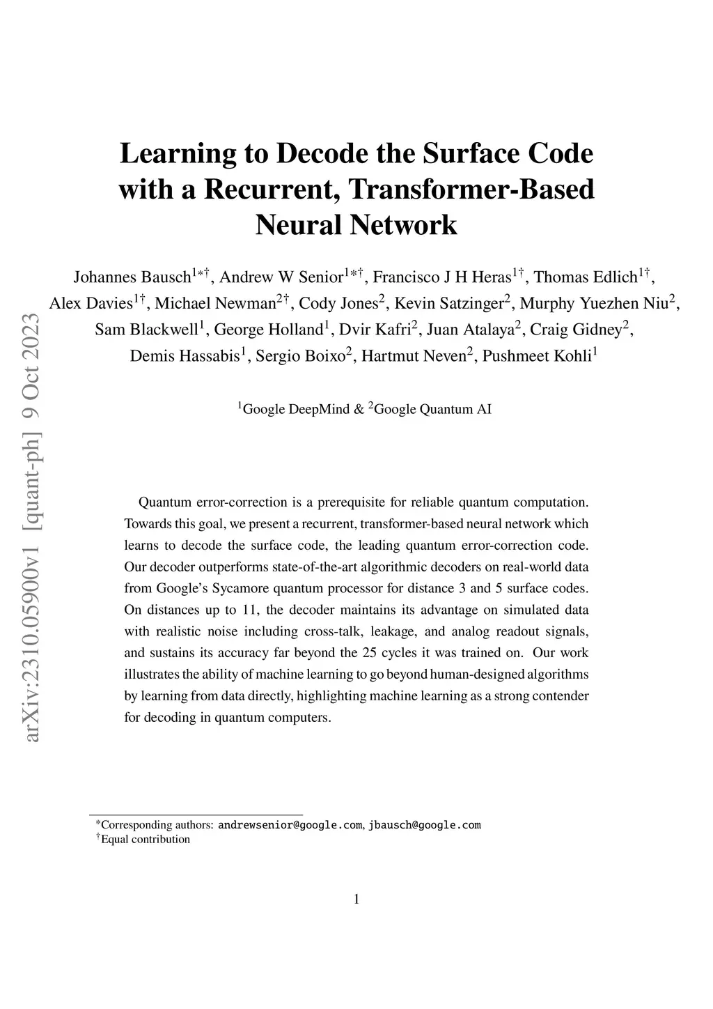 Quantum error-correction is a prerequisite for reliable quantum computation. Towards this goal, we present a recurrent, transformer-based neural network which learns to decode the surface code, the leading quantum error-correction code. Our decoder outperforms state-of-the-art algorithmic decoders on real-world data from Google's Sycamore quantum processor for distance 3 and 5 surface codes. On distances up to 11, the decoder maintains its advantage on simulated data with realistic noise including cross-talk, leakage, and analog readout signals, and sustains its accuracy far beyond the 25 cycles it was trained on. Our work illustrates the ability of machine learning to go beyond human-designed algorithms by learning from data directly, highlighting machine learning as a strong contender for decoding in quantum computers.