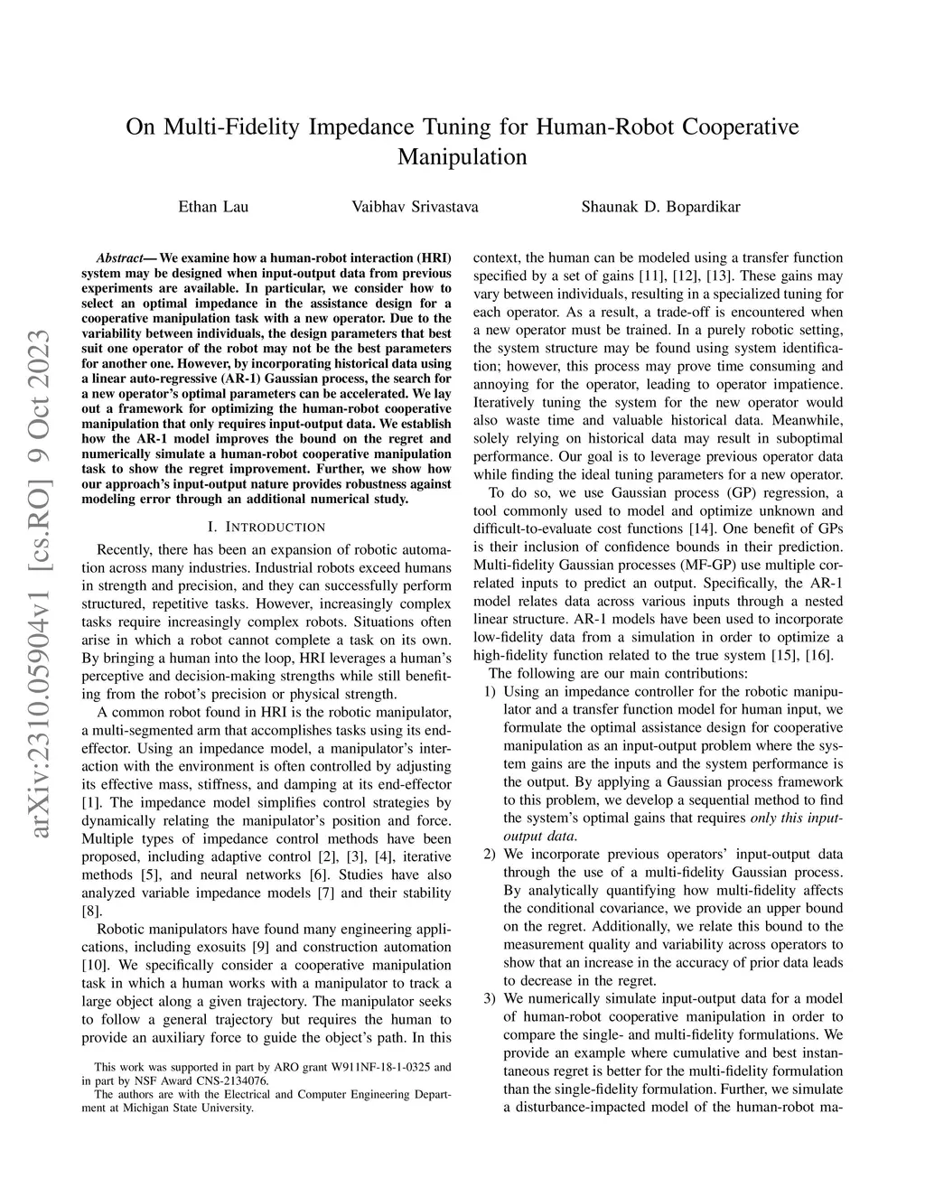 We examine how a human-robot interaction (HRI) system may be designed when input-output data from previous experiments are available. In particular, we consider how to select an optimal impedance in the assistance design for a cooperative manipulation task with a new operator. Due to the variability between individuals, the design parameters that best suit one operator of the robot may not be the best parameters for another one. However, by incorporating historical data using a linear auto-regressive (AR-1) Gaussian process, the search for a new operator's optimal parameters can be accelerated. We lay out a framework for optimizing the human-robot cooperative manipulation that only requires input-output data. We establish how the AR-1 model improves the bound on the regret and numerically simulate a human-robot cooperative manipulation task to show the regret improvement. Further, we show how our approach's input-output nature provides robustness against modeling error through an additional numerical study.