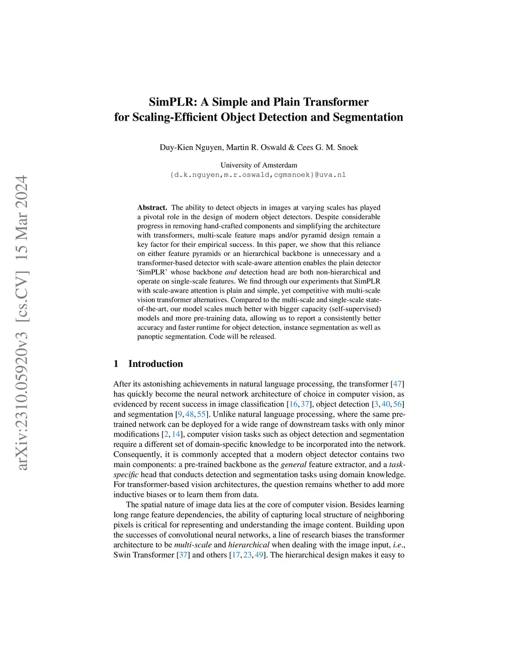 The ability to detect objects in images at varying scales has played a pivotal role in the design of modern object detectors. Despite considerable progress in removing hand-crafted components and simplifying the architecture with transformers, multi-scale feature maps and pyramid designs remain a key factor for their empirical success. In this paper, we show that shifting the multiscale inductive bias into the attention mechanism can work well, resulting in a plain detector `SimPLR' whose backbone and detection head are both non-hierarchical and operate on single-scale features. We find through our experiments that SimPLR with scale-aware attention is plain and simple architecture, yet competitive with multi-scale vision transformer alternatives. Compared to the multi-scale and single-scale state-of-the-art, our model scales better with bigger capacity (self-supervised) models and more pre-training data, allowing us to report a consistently better accuracy and faster runtime for object detection, instance segmentation, as well as panoptic segmentation. Code is released atthis https URL.