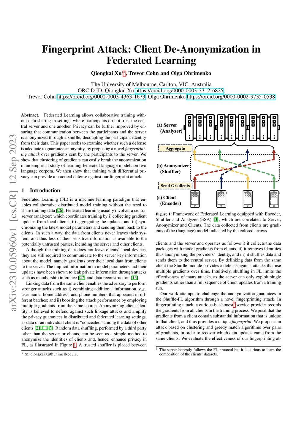 Federated Learning allows collaborative training without data sharing in settings where participants do not trust the central server and one another. Privacy can be further improved by ensuring that communication between the participants and the server is anonymized through a shuffle; decoupling the participant identity from their data. This paper seeks to examine whether such a defense is adequate to guarantee anonymity, by proposing a novel fingerprinting attack over gradients sent by the participants to the server. We show that clustering of gradients can easily break the anonymization in an empirical study of learning federated language models on two language corpora. We then show that training with differential privacy can provide a practical defense against our fingerprint attack.