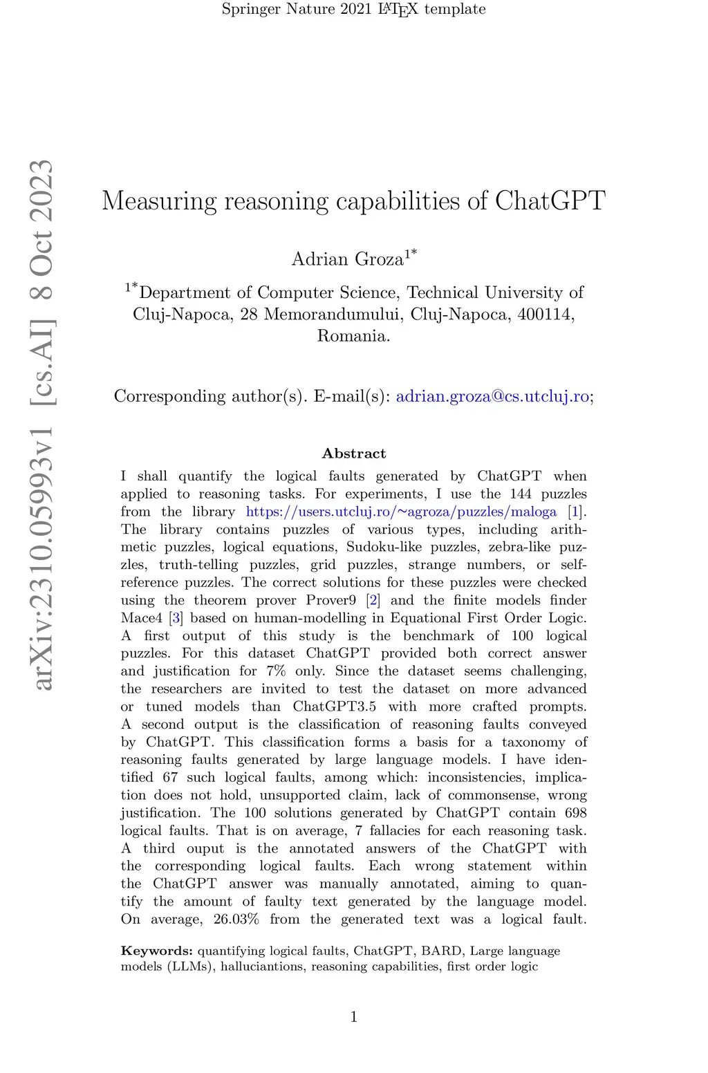 I shall quantify the logical faults generated by ChatGPT when applied to reasoning tasks. For experiments, I use the 144 puzzles from the library \url{https://users.utcluj.ro/~agroza/puzzles/maloga}~\cite{groza:fol}. The library contains puzzles of various types, including arithmetic puzzles, logical equations, Sudoku-like puzzles, zebra-like puzzles, truth-telling puzzles, grid puzzles, strange numbers, or self-reference puzzles. The correct solutions for these puzzles were checked using the theorem prover Prover9~\cite{mccune2005release} and the finite models finder Mace4~\cite{mccune2003mace4} based on human-modelling in Equational First Order Logic. A first output of this study is the benchmark of 100 logical puzzles. For this dataset ChatGPT provided both correct answer and justification for 7\% only. %, while BARD for 5\%. Since the dataset seems challenging, the researchers are invited to test the dataset on more advanced or tuned models than ChatGPT3.5 with more crafted prompts. A second output is the classification of reasoning faults conveyed by ChatGPT. This classification forms a basis for a taxonomy of reasoning faults generated by large language models. I have identified 67 such logical faults, among which: inconsistencies, implication does not hold, unsupported claim, lack of commonsense, wrong justification. The 100 solutions generated by ChatGPT contain 698 logical faults. That is on average, 7 fallacies for each reasoning task. A third ouput is the annotated answers of the ChatGPT with the corresponding logical faults. Each wrong statement within the ChatGPT answer was manually annotated, aiming to quantify the amount of faulty text generated by the language model. On average, 26.03\% from the generated text was a logical fault.