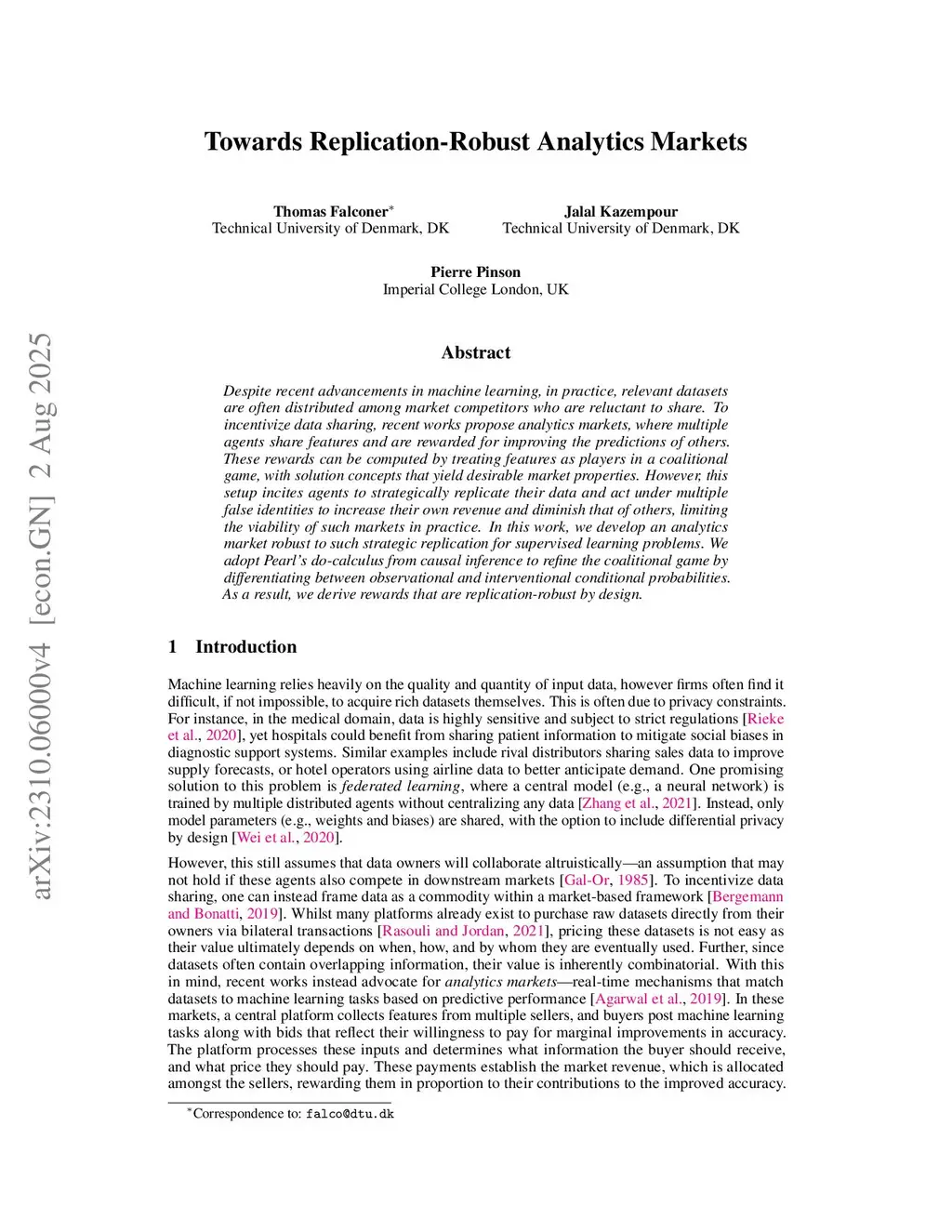 Despite recent advancements in machine learning, in practice, relevant datasets are often distributed among market competitors who are reluctant to share. To incentivize data sharing, recent works propose analytics markets, where multiple agents share features and are rewarded for improving the predictions of others. These rewards can be computed by treating features as players in a coalitional game, with solution concepts that yield desirable market properties. However, this setup incites agents to strategically replicate their data and act under multiple false identities to increase their own revenue and diminish that of others, limiting the viability of such markets in practice. In this work, we develop an analytics market robust to such strategic replication for supervised learning problems. We adopt Pearl's do-calculus from causal inference to refine the coalitional game by differentiating between observational and interventional conditional probabilities. As a result, we derive rewards that are replication-robust by design.