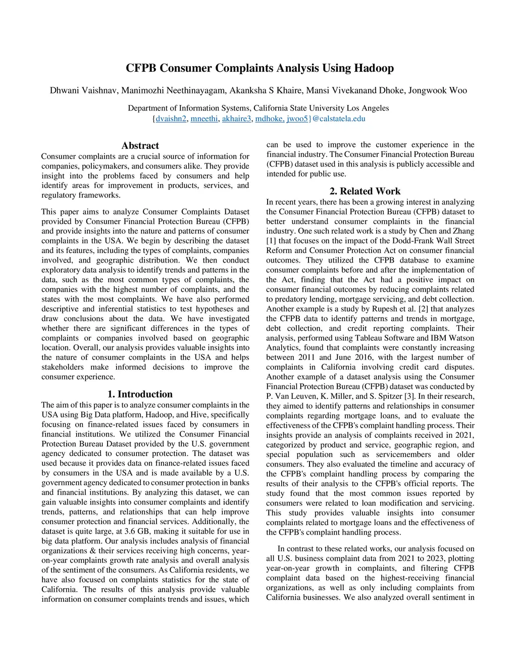 Consumer complaints are a crucial source of information for companies, policymakers, and consumers alike. They provide insight into the problems faced by consumers and help identify areas for improvement in products, services, and regulatory frameworks. This paper aims to analyze Consumer Complaints Dataset provided by Consumer Financial Protection Bureau (CFPB) and provide insights into the nature and patterns of consumer complaints in the USA. We begin by describing the dataset and its features, including the types of complaints, companies involved, and geographic distribution. We then conduct exploratory data analysis to identify trends and patterns in the data, such as the most common types of complaints, the companies with the highest number of complaints, and the states with the most complaints. We have also performed descriptive and inferential statistics to test hypotheses and draw conclusions about the data. We have investigated whether there are significant differences in the types of complaints or companies involved based on geographic location. Overall, our analysis provides valuable insights into the nature of consumer complaints in the USA and helps stakeholders make informed decisions to improve the consumer experience.