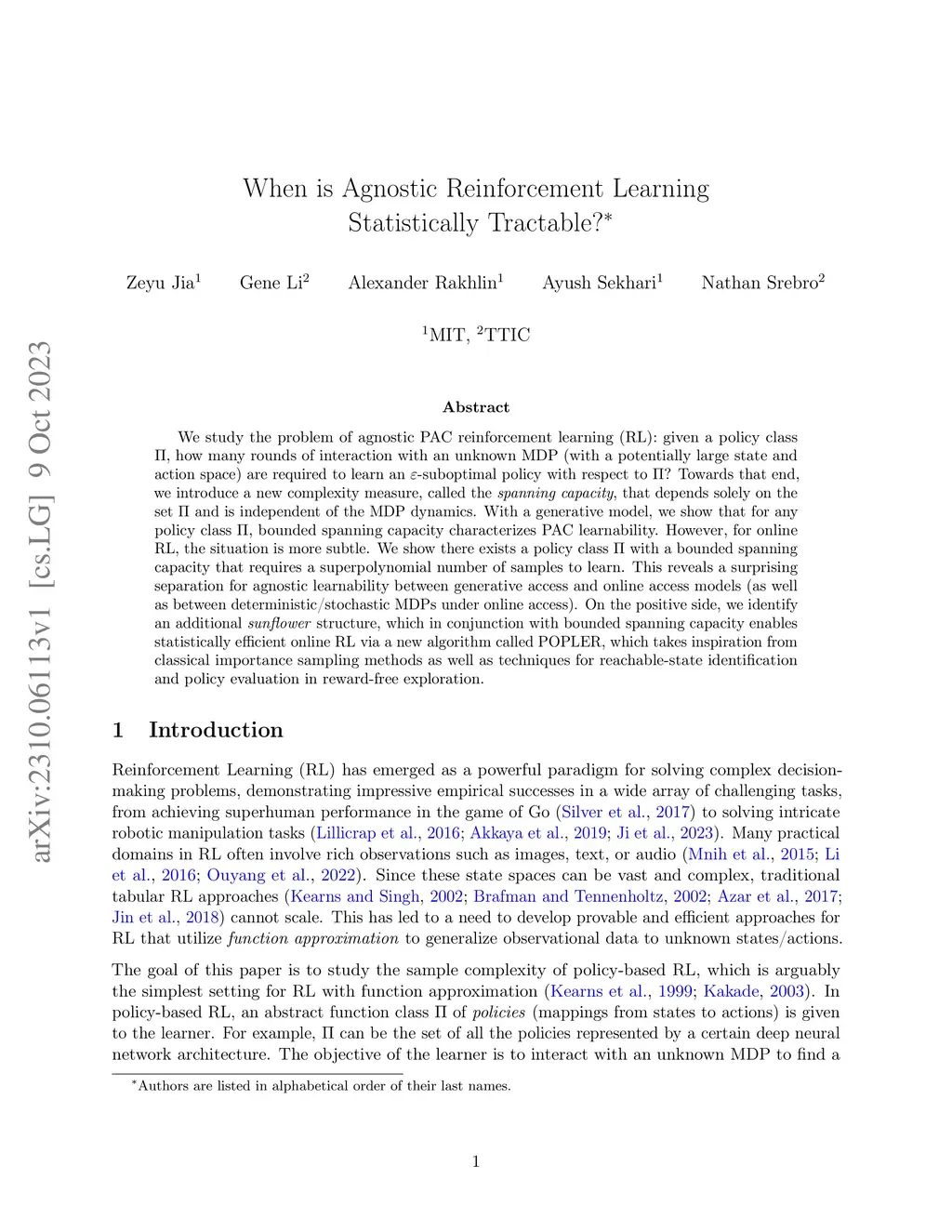 We study the problem of agnostic PAC reinforcement learning (RL): given a policy class , how many rounds of interaction with an unknown MDP (with a potentially large state and action space) are required to learn an -suboptimal policy with respect to ? Towards that end, we introduce a new complexity measure, called the \emph{spanning capacity}, that depends solely on the set and is independent of the MDP dynamics. With a generative model, we show that for any policy class , bounded spanning capacity characterizes PAC learnability. However, for online RL, the situation is more subtle. We show there exists a policy class with a bounded spanning capacity that requires a superpolynomial number of samples to learn. This reveals a surprising separation for agnostic learnability between generative access and online access models (as well as between deterministic/stochastic MDPs under online access). On the positive side, we identify an additional \emph{sunflower} structure, which in conjunction with bounded spanning capacity enables statistically efficient online RL via a new algorithm called POPLER, which takes inspiration from classical importance sampling methods as well as techniques for reachable-state identification and policy evaluation in reward-free exploration.
