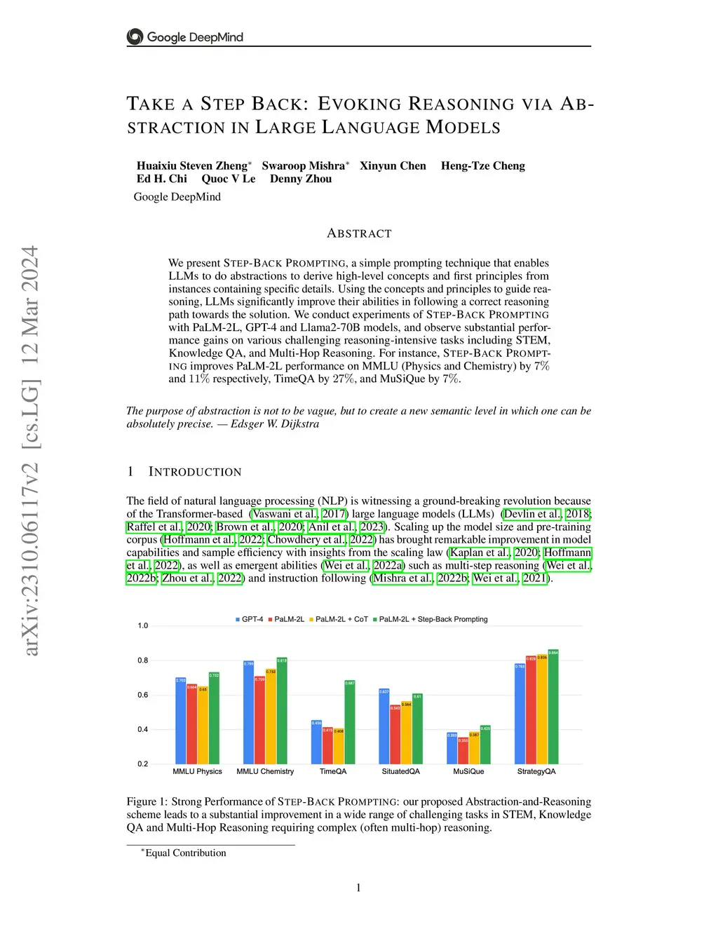 We present Step-Back Prompting, a simple prompting technique that enables LLMs to do abstractions to derive high-level concepts and first principles from instances containing specific details. Using the concepts and principles to guide reasoning, LLMs significantly improve their abilities in following a correct reasoning path towards the solution. We conduct experiments of Step-Back Prompting with PaLM-2L, GPT-4 and Llama2-70B models, and observe substantial performance gains on various challenging reasoning-intensive tasks including STEM, Knowledge QA, and Multi-Hop Reasoning. For instance, Step-Back Prompting improves PaLM-2L performance on MMLU (Physics and Chemistry) by 7% and 11% respectively, TimeQA by 27%, and MuSiQue by 7%.