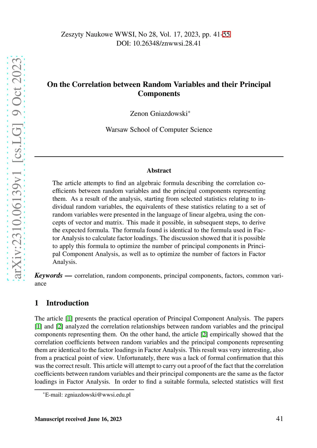 The article attempts to find an algebraic formula describing the correlation coefficients between random variables and the principal components representing them. As a result of the analysis, starting from selected statistics relating to individual random variables, the equivalents of these statistics relating to a set of random variables were presented in the language of linear algebra, using the concepts of vector and matrix. This made it possible, in subsequent steps, to derive the expected formula. The formula found is identical to the formula used in Factor Analysis to calculate factor loadings. The discussion showed that it is possible to apply this formula to optimize the number of principal components in Principal Component Analysis, as well as to optimize the number of factors in Factor Analysis.