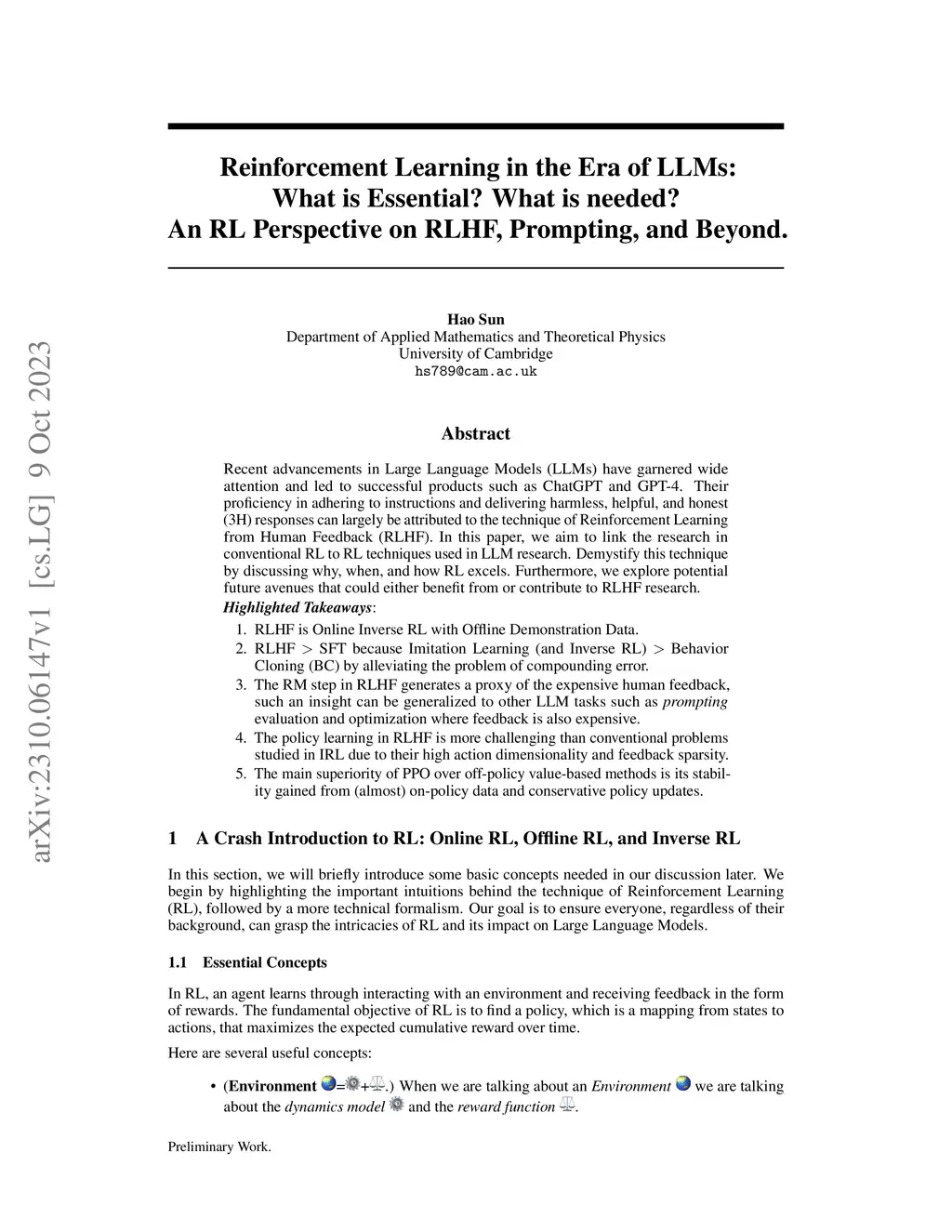 Reinforcement Learning in the Era of LLMs: What is Essential? What is