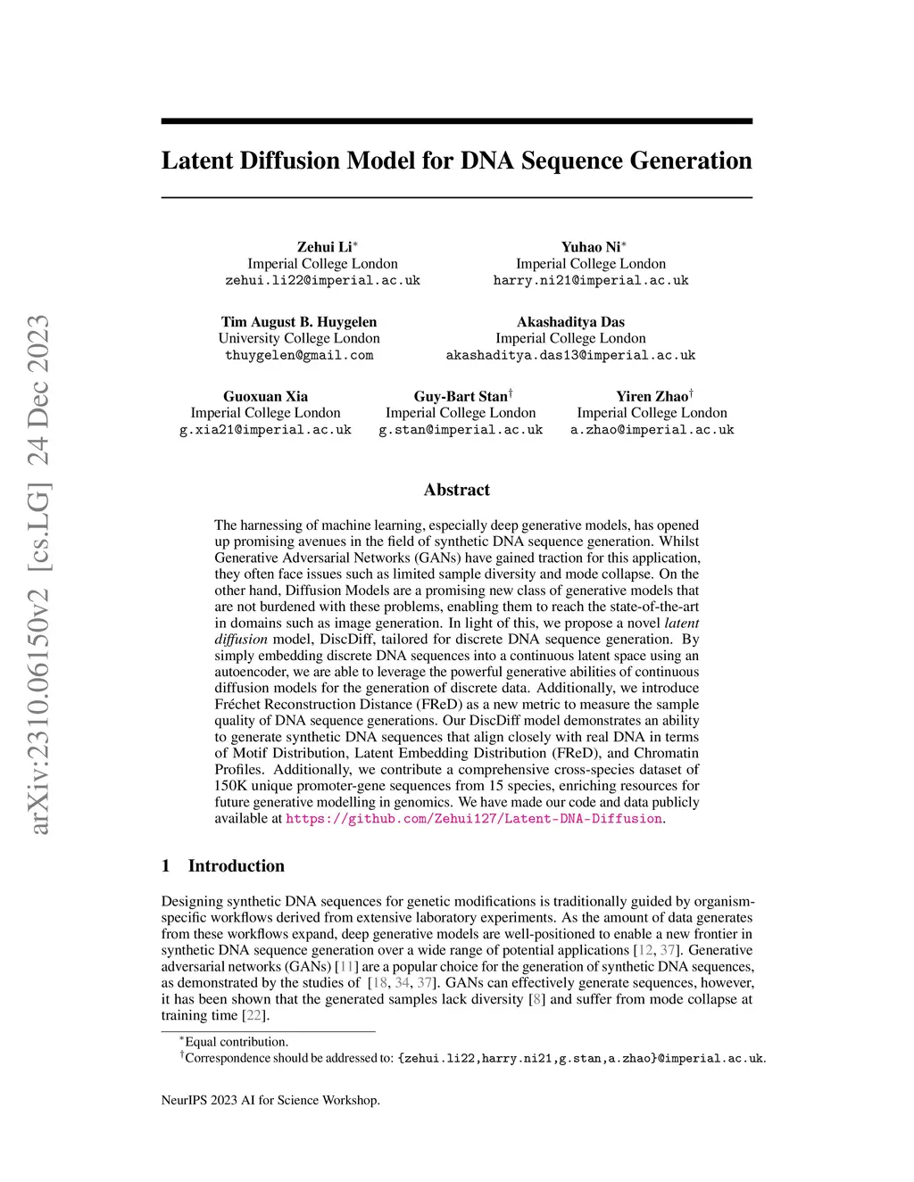 The harnessing of machine learning, especially deep generative models, has opened up promising avenues in the field of synthetic DNA sequence generation. Whilst Generative Adversarial Networks (GANs) have gained traction for this application, they often face issues such as limited sample diversity and mode collapse. On the other hand, Diffusion Models are a promising new class of generative models that are not burdened with these problems, enabling them to reach the state-of-the-art in domains such as image generation. In light of this, we propose a novel latent diffusion model, DiscDiff, tailored for discrete DNA sequence generation. By simply embedding discrete DNA sequences into a continuous latent space using an autoencoder, we are able to leverage the powerful generative abilities of continuous diffusion models for the generation of discrete data. Additionally, we introduce Fr\échet Reconstruction Distance (FReD) as a new metric to measure the sample quality of DNA sequence generations. Our DiscDiff model demonstrates an ability to generate synthetic DNA sequences that align closely with real DNA in terms of Motif Distribution, Latent Embedding Distribution (FReD), and Chromatin Profiles. Additionally, we contribute a comprehensive cross-species dataset of 150K unique promoter-gene sequences from 15 species, enriching resources for future generative modelling in genomics. We will make our code public upon publication.