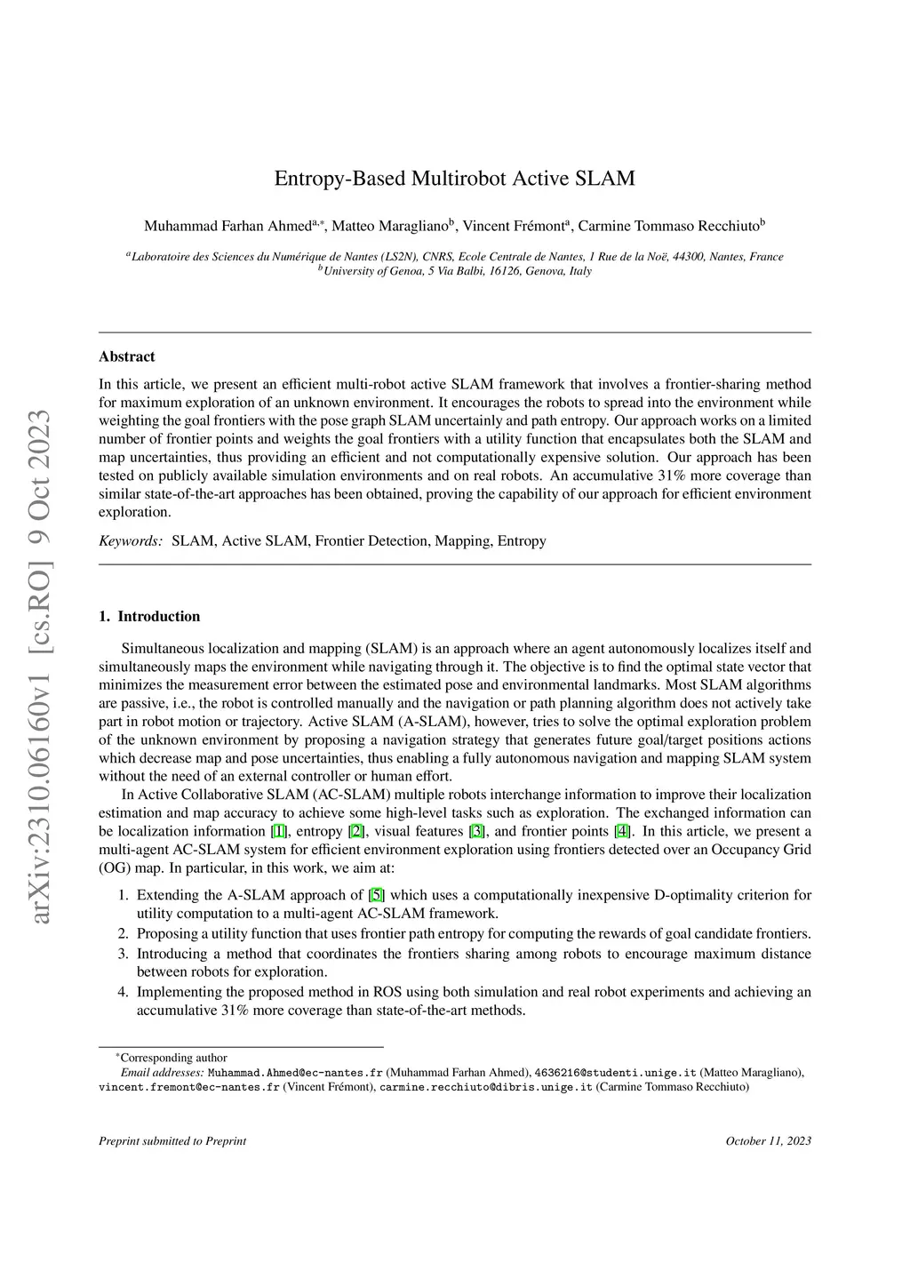 Autonomous exploration in unknown environments remains a fundamental challenge in robotics, particularly for applications such as search and rescue, industrial inspection, and planetary exploration. Multi-robot active SLAM presents a promising solution by enabling collaborative mapping and exploration while actively reducing uncertainty. However, existing approaches often suffer from high computational costs and inefficient frontier management, making them computationally expensive for real-time applications. In this paper, we introduce an efficient multi-robot active SLAM framework that incorporates a frontier-sharing strategy to enhance robot distribution in unexplored environments. Our approach integrates a utility function that considers both pose graph uncertainty and path entropy, achieving an optimal balance between exploration coverage and computational efficiency. By filtering and prioritizing goal frontiers, our method significantly reduces computational overhead while preserving high mapping accuracy. The proposed framework has been implemented in ROS and validated through simulations and real-world experiments. Results demonstrate superior exploration performance and mapping quality compared to state-of-the-art approaches.