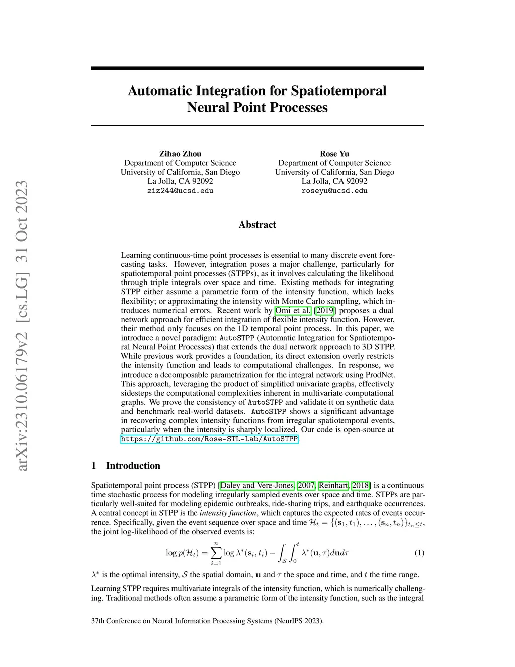 Learning continuous-time point processes is essential to many discrete event forecasting tasks. However, integration poses a major challenge, particularly for spatiotemporal point processes (STPPs), as it involves calculating the likelihood through triple integrals over space and time. Existing methods for integrating STPP either assume a parametric form of the intensity function, which lacks flexibility; or approximating the intensity with Monte Carlo sampling, which introduces numerical errors. Recent work by Omi et al. [2019] proposes a dual network approach for efficient integration of flexible intensity function. However, their method only focuses on the 1D temporal point process. In this paper, we introduce a novel paradigm: AutoSTPP (Automatic Integration for Spatiotemporal Neural Point Processes) that extends the dual network approach to 3D STPP. While previous work provides a foundation, its direct extension overly restricts the intensity function and leads to computational challenges. In response, we introduce a decomposable parametrization for the integral network using ProdNet. This approach, leveraging the product of simplified univariate graphs, effectively sidesteps the computational complexities inherent in multivariate computational graphs. We prove the consistency of AutoSTPP and validate it on synthetic data and benchmark real-world datasets. AutoSTPP shows a significant advantage in recovering complex intensity functions from irregular spatiotemporal events, particularly when the intensity is sharply localized. Our code is open-source at https://github.com/Rose-STL-Lab/AutoSTPP.