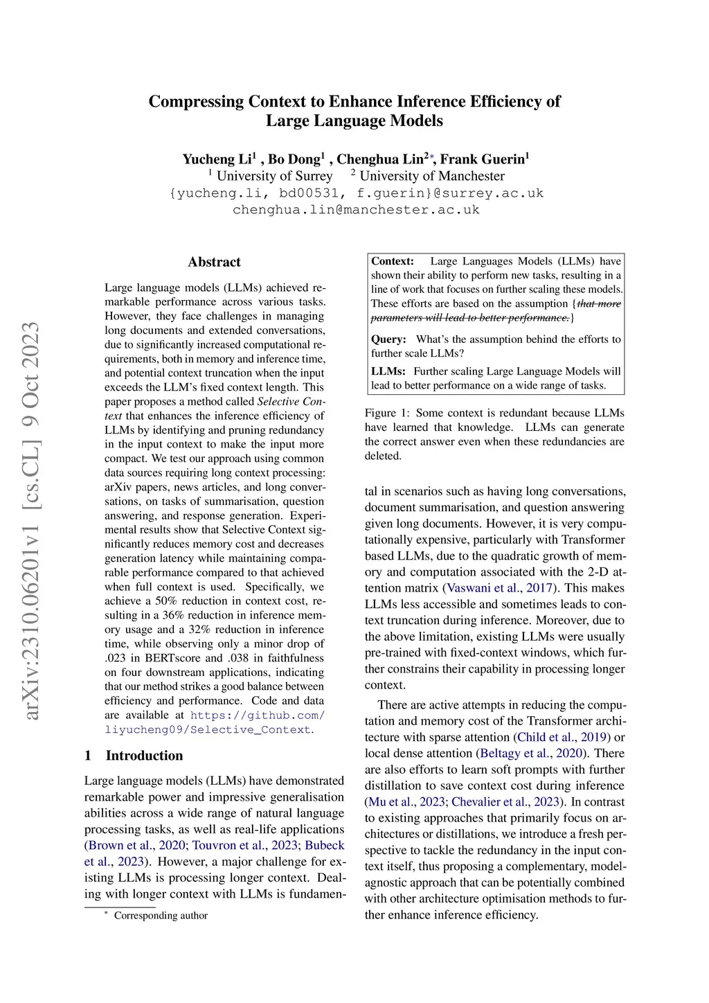 Large language models (LLMs) achieved remarkable performance across various tasks. However, they face challenges in managing long documents and extended conversations, due to significantly increased computational requirements, both in memory and inference time, and potential context truncation when the input exceeds the LLM's fixed context length. This paper proposes a method called Selective Context that enhances the inference efficiency of LLMs by identifying and pruning redundancy in the input context to make the input more compact. We test our approach using common data sources requiring long context processing: arXiv papers, news articles, and long conversations, on tasks of summarisation, question answering, and response generation. Experimental results show that Selective Context significantly reduces memory cost and decreases generation latency while maintaining comparable performance compared to that achieved when full context is used. Specifically, we achieve a 50\% reduction in context cost, resulting in a 36\% reduction in inference memory usage and a 32\% reduction in inference time, while observing only a minor drop of .023 in BERTscore and .038 in faithfulness on four downstream applications, indicating that our method strikes a good balance between efficiency and performance.