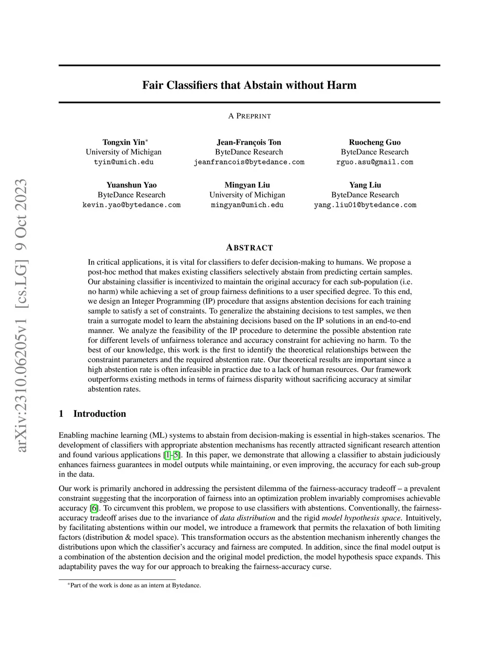 In critical applications, it is vital for classifiers to defer decision-making to humans. We propose a post-hoc method that makes existing classifiers selectively abstain from predicting certain samples. Our abstaining classifier is incentivized to maintain the original accuracy for each sub-population (i.e. no harm) while achieving a set of group fairness definitions to a user specified degree. To this end, we design an Integer Programming (IP) procedure that assigns abstention decisions for each training sample to satisfy a set of constraints. To generalize the abstaining decisions to test samples, we then train a surrogate model to learn the abstaining decisions based on the IP solutions in an end-to-end manner. We analyze the feasibility of the IP procedure to determine the possible abstention rate for different levels of unfairness tolerance and accuracy constraint for achieving no harm. To the best of our knowledge, this work is the first to identify the theoretical relationships between the constraint parameters and the required abstention rate. Our theoretical results are important since a high abstention rate is often infeasible in practice due to a lack of human resources. Our framework outperforms existing methods in terms of fairness disparity without sacrificing accuracy at similar abstention rates.