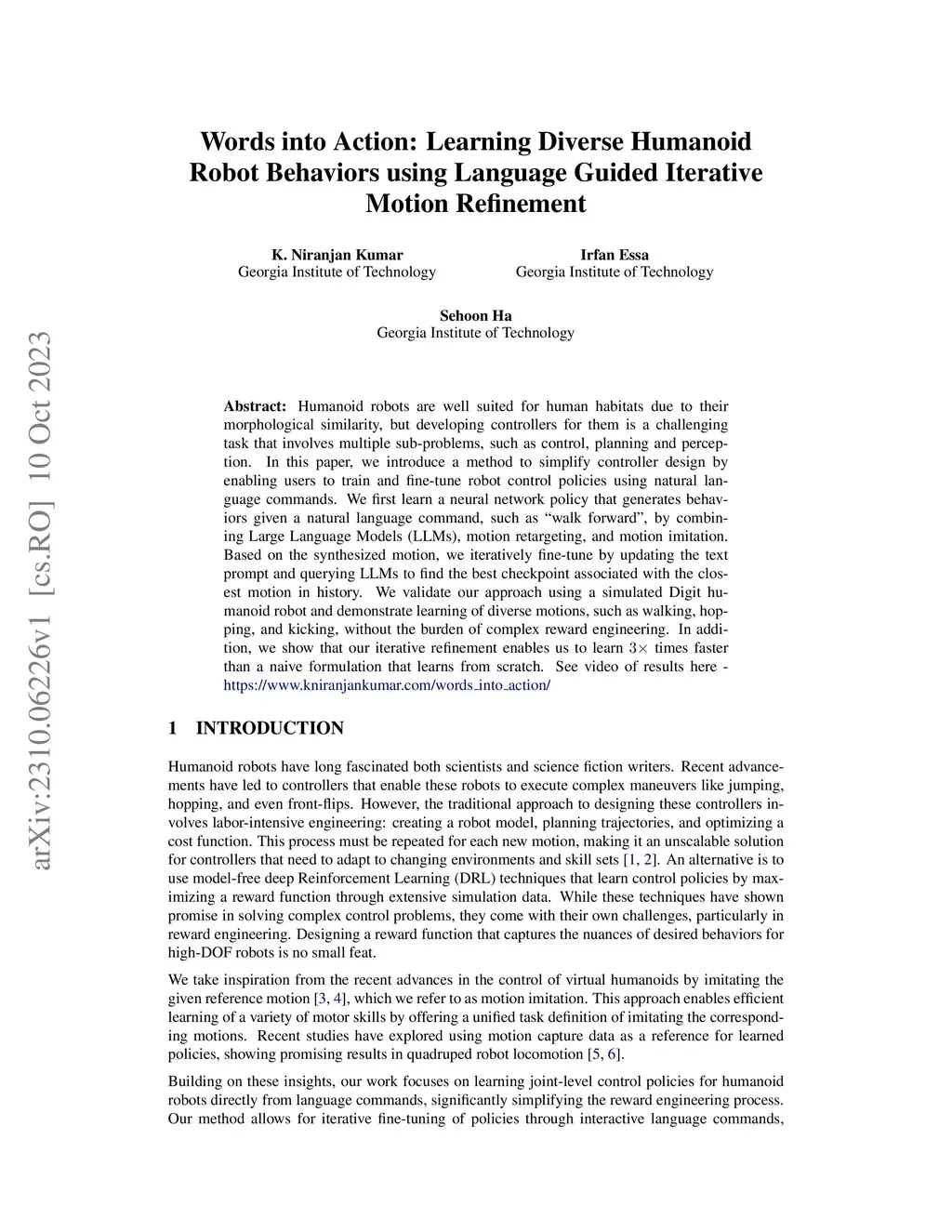 Humanoid robots are well suited for human habitats due to their morphological similarity, but developing controllers for them is a challenging task that involves multiple sub-problems, such as control, planning and perception. In this paper, we introduce a method to simplify controller design by enabling users to train and fine-tune robot control policies using natural language commands. We first learn a neural network policy that generates behaviors given a natural language command, such as "walk forward", by combining Large Language Models (LLMs), motion retargeting, and motion imitation. Based on the synthesized motion, we iteratively fine-tune by updating the text prompt and querying LLMs to find the best checkpoint associated with the closest motion in history. We validate our approach using a simulated Digit humanoid robot and demonstrate learning of diverse motions, such as walking, hopping, and kicking, without the burden of complex reward engineering. In addition, we show that our iterative refinement enables us to learn 3x times faster than a naive formulation that learns from scratch.