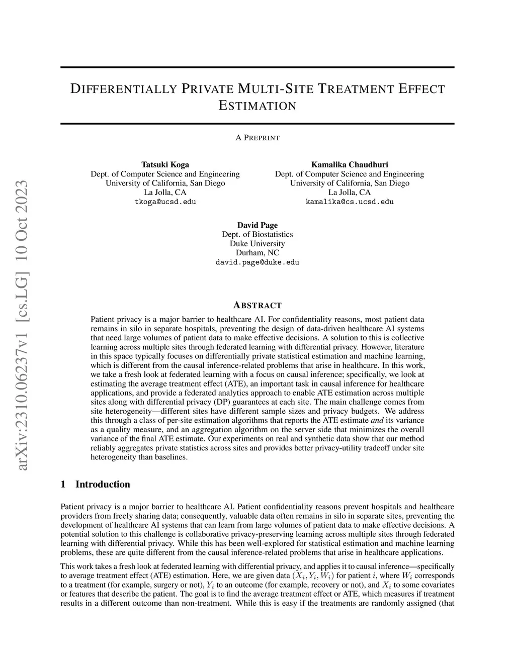 Patient privacy is a major barrier to healthcare AI. For confidentiality reasons, most patient data remains in silo in separate hospitals, preventing the design of data-driven healthcare AI systems that need large volumes of patient data to make effective decisions. A solution to this is collective learning across multiple sites through federated learning with differential privacy. However, literature in this space typically focuses on differentially private statistical estimation and machine learning, which is different from the causal inference-related problems that arise in healthcare. In this work, we take a fresh look at federated learning with a focus on causal inference; specifically, we look at estimating the average treatment effect (ATE), an important task in causal inference for healthcare applications, and provide a federated analytics approach to enable ATE estimation across multiple sites along with differential privacy (DP) guarantees at each site. The main challenge comes from site heterogeneity -- different sites have different sample sizes and privacy budgets. We address this through a class of per-site estimation algorithms that reports the ATE estimate and its variance as a quality measure, and an aggregation algorithm on the server side that minimizes the overall variance of the final ATE estimate. Our experiments on real and synthetic data show that our method reliably aggregates private statistics across sites and provides better privacy-utility tradeoff under site heterogeneity than baselines.