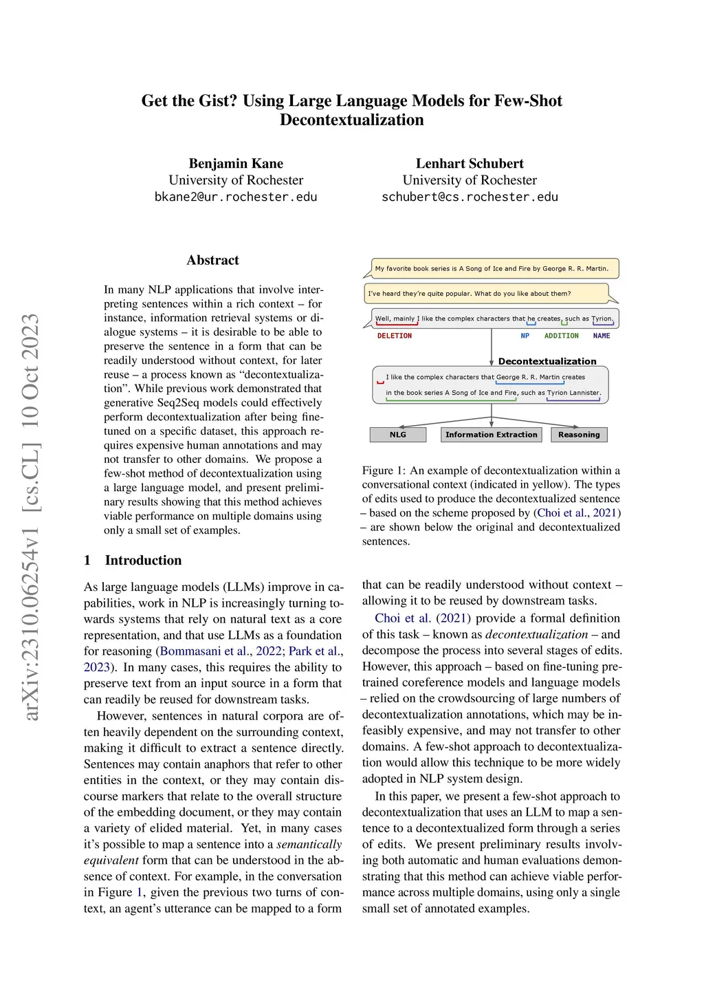 In many NLP applications that involve interpreting sentences within a rich context -- for instance, information retrieval systems or dialogue systems -- it is desirable to be able to preserve the sentence in a form that can be readily understood without context, for later reuse -- a process known as ``decontextualization''. While previous work demonstrated that generative Seq2Seq models could effectively perform decontextualization after being fine-tuned on a specific dataset, this approach requires expensive human annotations and may not transfer to other domains. We propose a few-shot method of decontextualization using a large language model, and present preliminary results showing that this method achieves viable performance on multiple domains using only a small set of examples.