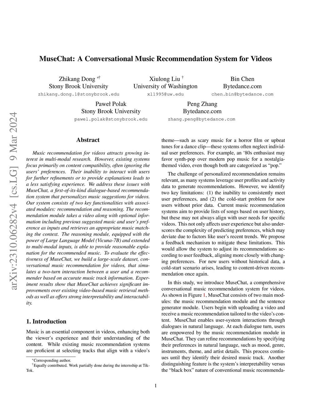 Music recommendation for videos attracts growing interest in multi-modal research. However, existing systems focus primarily on content compatibility, often ignoring the users' preferences. Their inability to interact with users for further refinements or to provide explanations leads to a less satisfying experience. We address these issues with MuseChat, a first-of-its-kind dialogue-based recommendation system that personalizes music suggestions for videos. Our system consists of two key functionalities with associated modules: recommendation and reasoning. The recommendation module takes a video along with optional information including previous suggested music and user's preference as inputs and retrieves an appropriate music matching the context. The reasoning module, equipped with the power of Large Language Model (Vicuna-7B) and extended to multi-modal inputs, is able to provide reasonable explanation for the recommended music. To evaluate the effectiveness of MuseChat, we build a large-scale dataset, conversational music recommendation for videos, that simulates a two-turn interaction between a user and a recommender based on accurate music track information. Experiment results show that MuseChat achieves significant improvements over existing video-based music retrieval methods as well as offers strong interpretability and interactability.