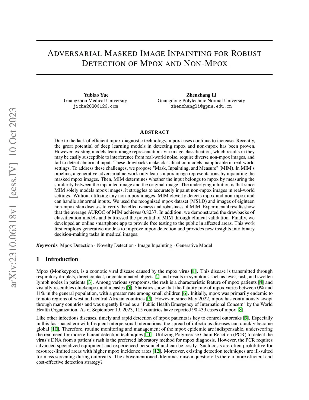 Due to the lack of efficient mpox diagnostic technology, mpox cases continue to increase. Recently, the great potential of deep learning models in detecting mpox and non-mpox has been proven. However, existing models learn image representations via image classification, which results in they may be easily susceptible to interference from real-world noise, require diverse non-mpox images, and fail to detect abnormal input. These drawbacks make classification models inapplicable in real-world settings. To address these challenges, we propose "Mask, Inpainting, and Measure" (MIM). In MIM's pipeline, a generative adversarial network only learns mpox image representations by inpainting the masked mpox images. Then, MIM determines whether the input belongs to mpox by measuring the similarity between the inpainted image and the original image. The underlying intuition is that since MIM solely models mpox images, it struggles to accurately inpaint non-mpox images in real-world settings. Without utilizing any non-mpox images, MIM cleverly detects mpox and non-mpox and can handle abnormal inputs. We used the recognized mpox dataset (MSLD) and images of eighteen non-mpox skin diseases to verify the effectiveness and robustness of MIM. Experimental results show that the average AUROC of MIM achieves 0.8237. In addition, we demonstrated the drawbacks of classification models and buttressed the potential of MIM through clinical validation. Finally, we developed an online smartphone app to provide free testing to the public in affected areas. This work first employs generative models to improve mpox detection and provides new insights into binary decision-making tasks in medical images.
