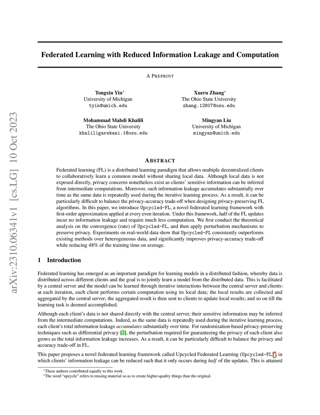 Federated learning (FL) is a distributed learning paradigm that allows multiple decentralized clients to collaboratively learn a common model without sharing local data. Although local data is not exposed directly, privacy concerns nonetheless exist as clients' sensitive information can be inferred from intermediate computations. Moreover, such information leakage accumulates substantially over time as the same data is repeatedly used during the iterative learning process. As a result, it can be particularly difficult to balance the privacy-accuracy trade-off when designing privacy-preserving FL algorithms. In this paper, we introduce Upcycled-FL, a novel federated learning framework with first-order approximation applied at every even iteration. Under this framework, half of the FL updates incur no information leakage and require much less computation. We first conduct the theoretical analysis on the convergence (rate) of Upcycled-FL, and then apply perturbation mechanisms to preserve privacy. Experiments on real-world data show that Upcycled-FL consistently outperforms existing methods over heterogeneous data, and significantly improves privacy-accuracy trade-off while reducing 48% of the training time on average.